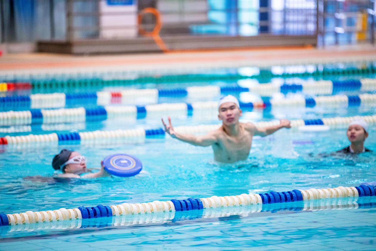 下午舉行的趣味項目更是精彩紛呈。聚集龍珠難度并不比常規(guī)項目低,要求兩名女選手把乒乓球運輸?shù)街付ㄎ恢煤笤谒嫒鲩_,兩名男選手又去救球,把乒乓球聚集在游泳圈內(nèi)又護(hù)送回岸邊。只見各隊八仙過海,各顯神通,紛紛拿出看家本領(lǐng)保護(hù)“龍珠”,泳池內(nèi)頓時水花綻放。水上飛盤項目不僅是力量與速度的競爭,更是考驗個人與團(tuán)隊的合作。2名隊員在岸邊輪流投擲飛盤,4名隊員在泳池中一字排開,或縱身一躍,或單手接盤,既緊張刺激,又妙趣橫生。
