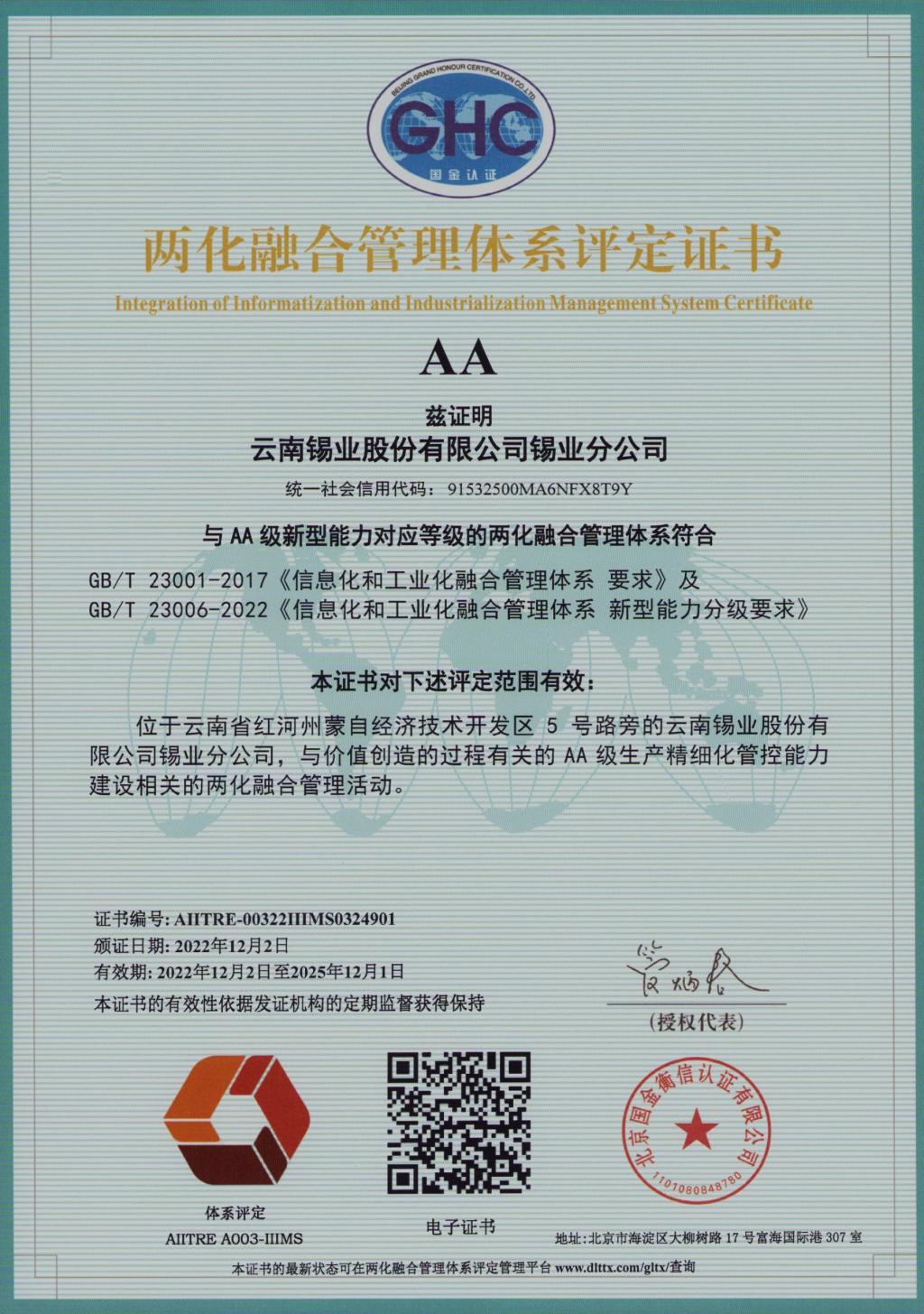 12月2日,錫業(yè)分公司順利通過國家工業(yè)和信息化部兩化融合管理體系升級版認(rèn)證,喜獲《兩化融合管理體系》AA級評定證書,成為云錫首家通過AA級認(rèn)定單位。