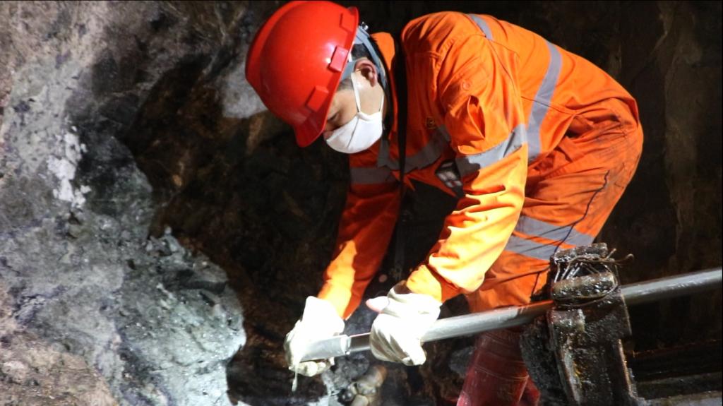 2010年,1750米中段600平巷深部延伸主體掘進(jìn)工程開工實(shí)施,風(fēng)化花崗巖大涌水、巖石松散,一系列棘手的問題擺在面前,組員們一時(shí)束手無策?!帮L(fēng)化花崗巖,他一進(jìn)水見風(fēng)就會(huì)全部變散變軟了,沒有支撐力。假如源頭涌水大,它很容易會(huì)卡釬,我們裝進(jìn)去的藥又會(huì)給我們沖出來,我們出渣的時(shí)候,道面上的水湧的很大,泥漿很大,然后在我們施工的時(shí)候給我們帶來很大的難度?!?750平臺(tái)作為連接1800與1600兩大平臺(tái)的重要平臺(tái),施工難度極大,但工程進(jìn)度不能停?!熬拖褚恢粩r路虎一樣樣,攔在我們的面前,使我們的掘進(jìn)無法開展”。時(shí)任主體掘進(jìn)工程三組組長楊勇沒有服輸,他主動(dòng)請(qǐng)纓,制定了一整套施工方案,決定虎口拔牙,迎頭松散的地方,楊勇就采取超前支護(hù)和以快制散的辦法,提前做好頂板的支護(hù),放炮后就火速架欀進(jìn)行側(cè)邦支護(hù)。面對(duì)特殊的地質(zhì)結(jié)構(gòu),布眼打眼時(shí),他也把自己的絕活兒毫不保留的教給大家?!懊恳粋€(gè)眼都要往外傾斜三到五度,如果是說它垂直進(jìn)去的話,那我們下一個(gè)循環(huán),我們的巷道越掘進(jìn)就會(huì)越小,他會(huì)影響我們鑿巖機(jī)的作業(yè)。”最終,1750中段主體掘進(jìn)工程提前86天全面完成施工任務(wù),而像這樣的工程,在往后十年,他手下,還有很多。