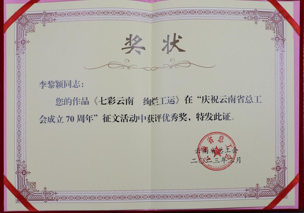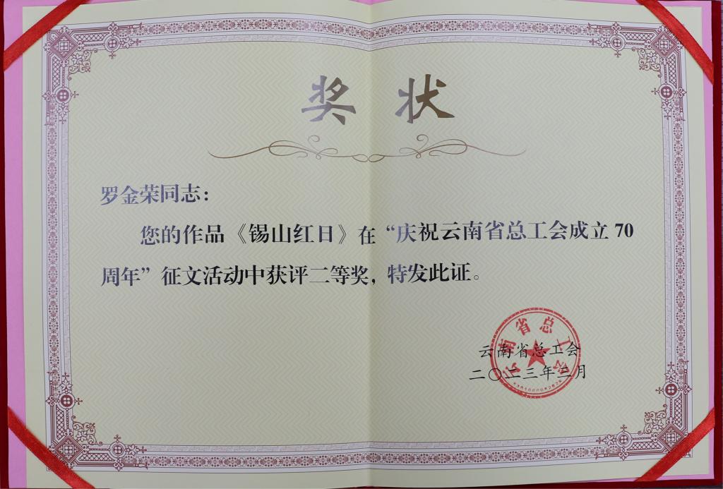近日,卡房分公司職工羅金榮撰寫的《錫山紅日·曙光》《錫山紅日·日出》兩篇文章在云南省總工會舉辦的“慶祝云南省總工會成立70周年”征文活動中榮獲二等獎(jiǎng),大屯錫礦職工李黎穎撰寫的《七彩云南 絢爛工運(yùn)》榮獲優(yōu)秀獎(jiǎng)。