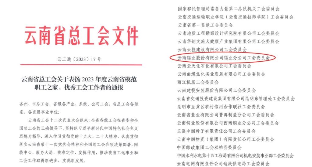 近日,云南省總工會印發(fā)了《關(guān)于表揚2023年度云南省模范職工之家、優(yōu)秀工會工作者的通報》,云南錫業(yè)股份有限公司錫業(yè)分公司工會委員會榮獲“云南省模范職工之家”稱號。