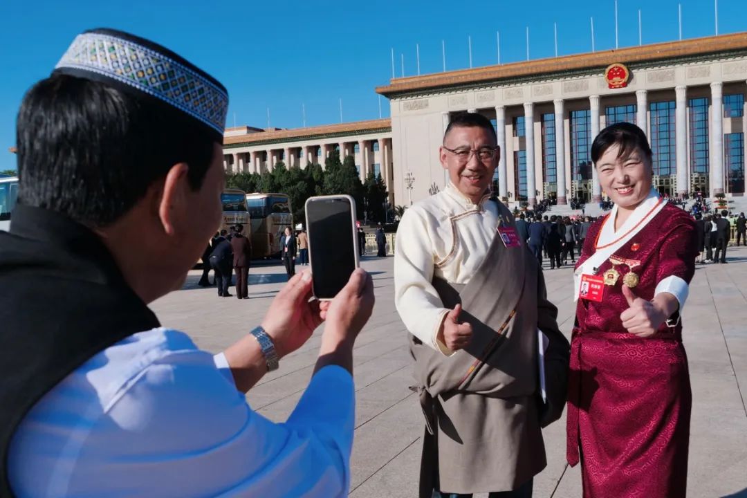 10月9日上午,中國工會十八大開幕式前,甘肅代表團的三位少數(shù)民族代表正在人民大會堂前拍照留念。工人日報通訊員 茹佳佳 攝