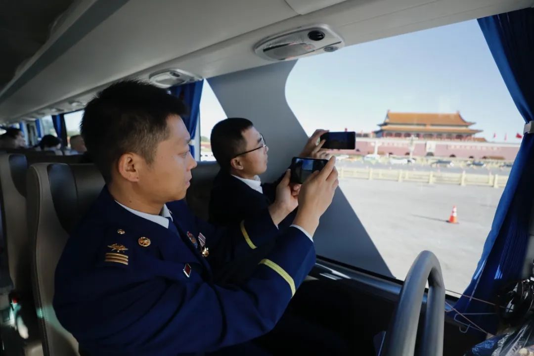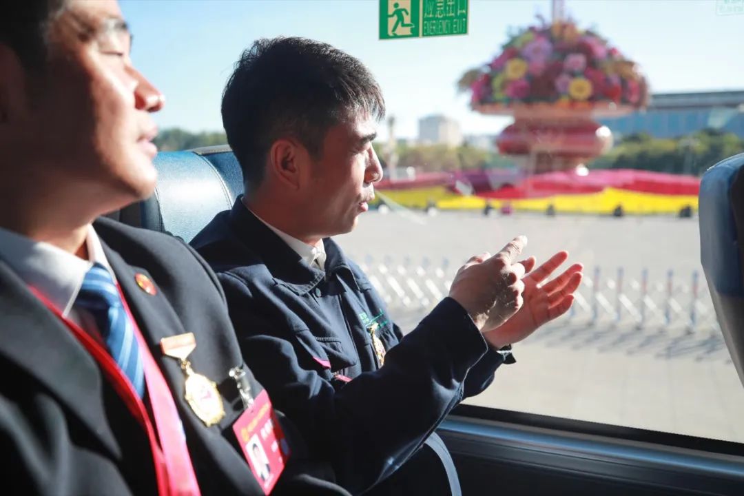 10月9日,在前往人民大會堂的路上,來自重慶團的工會十八大代表潘星寧(左一)和同座的代表在路過天安門時拍照留念。(工人日報記者 劉金夢 攝)