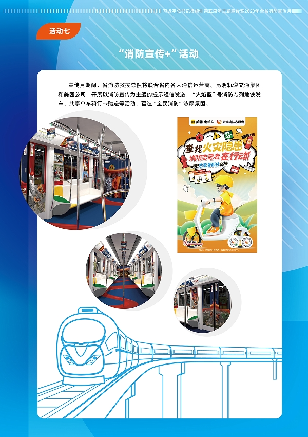 宣傳月期間,省消防救援總隊(duì)將聯(lián)合省內(nèi)各大通信運(yùn)營商、昆明軌道交通集團(tuán)和美團(tuán)公司,開展以消防宣傳為主題的提示短信發(fā)送、“火焰藍(lán)”號(hào)消防專列地鐵發(fā)車、共享單車騎行卡贈(zèng)送等活動(dòng),營造“全民學(xué)消防”的濃厚氛圍。