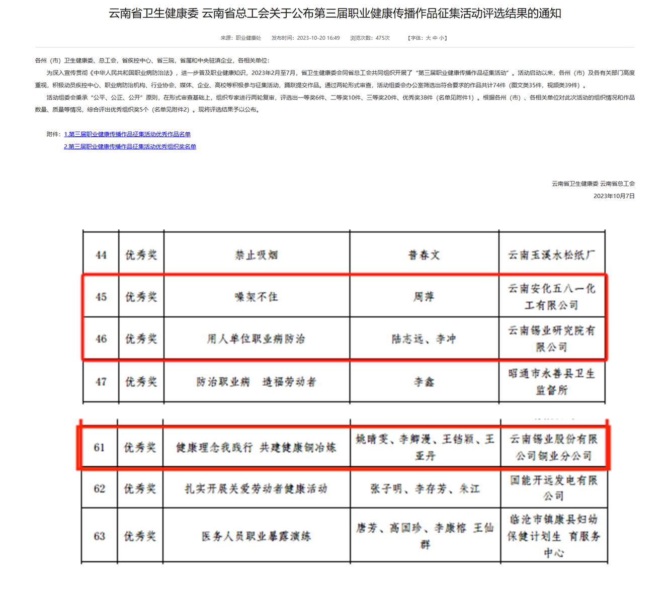 近日,由國家衛(wèi)生健康委和中華全國總工會統(tǒng)一部署,省衛(wèi)生健康委和省總工會聯(lián)合舉辦第三屆職業(yè)健康傳播作品征集活動評選結(jié)果揭曉,研究院公司選送的《用人單位職業(yè)病防治》;安化五八一公司選送的《噪架不住》;銅業(yè)分公司選送的《健康理念我踐行共建健康銅冶煉》3件作品均榮獲優(yōu)秀獎。