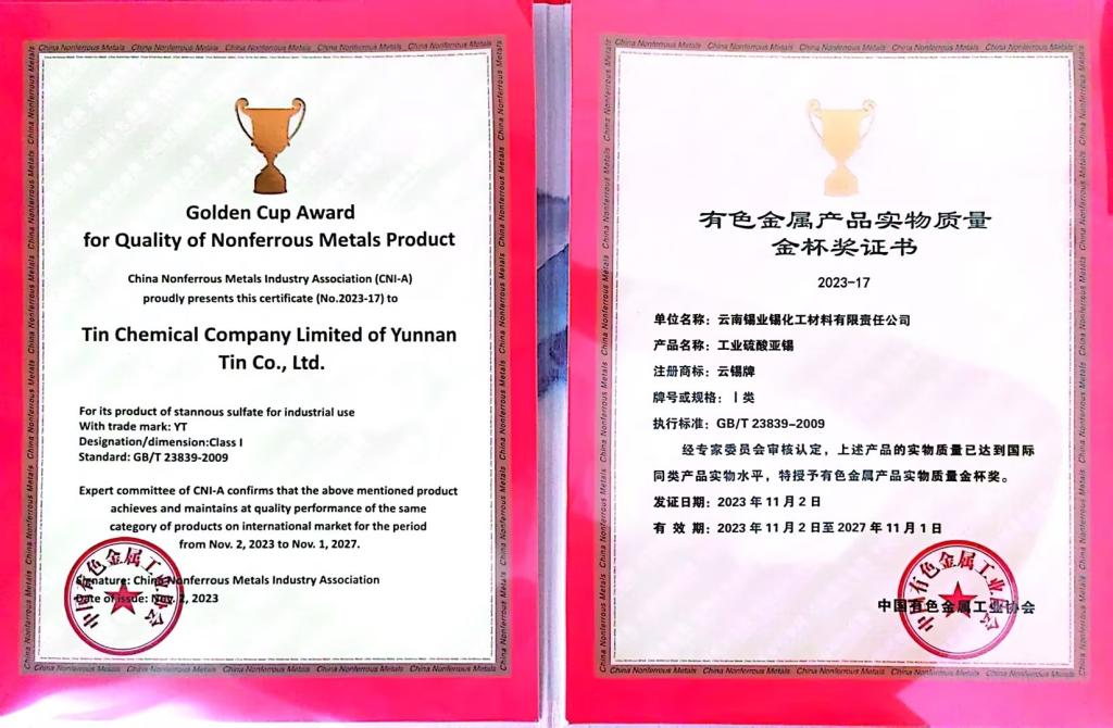 錫化工“五位一體”全面質量管理模式收錄入大會專刊;工業(yè)硫酸亞錫產品獲“有色金屬產品實物質量金杯獎”;甲基錫錫化工班組榮獲有色金屬行業(yè)質量信得過班組建設“特級班組”。