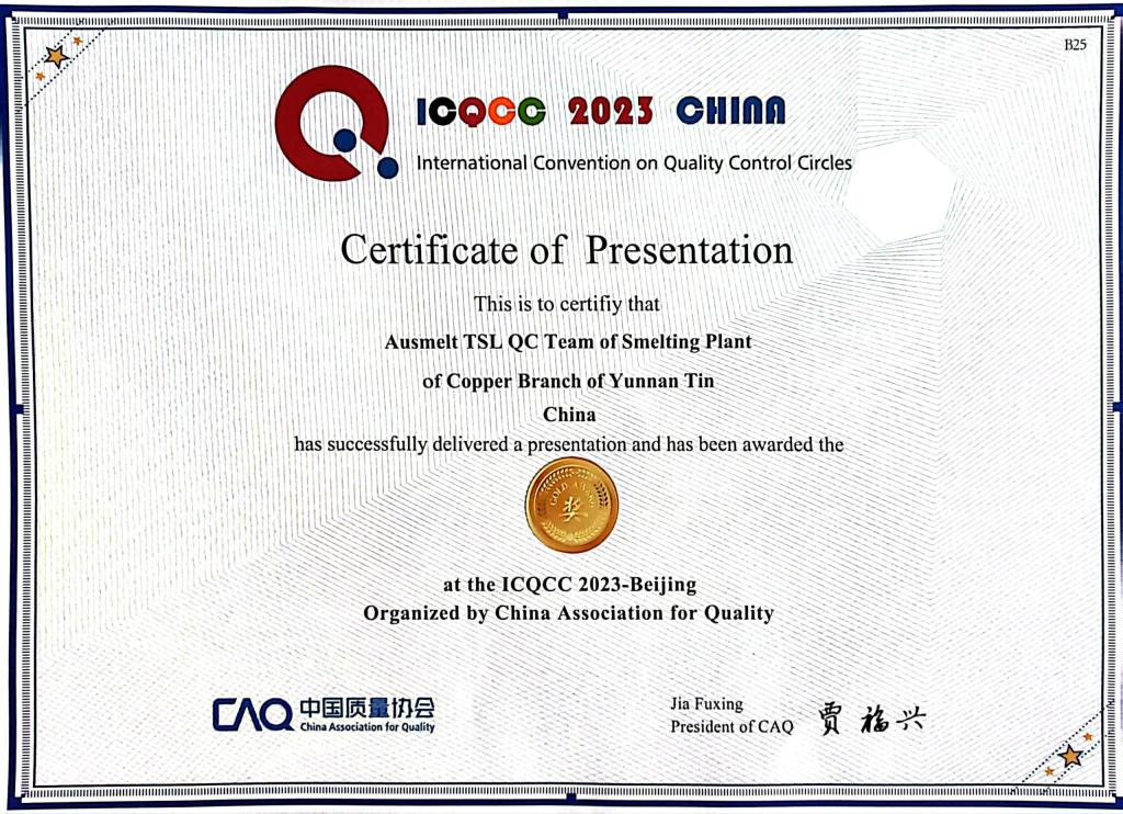 銅業(yè)分公司熔煉車間頂吹QC小組《降低爐殼鋼水套堵塞次數》課題獲國際質量管理小組金獎。