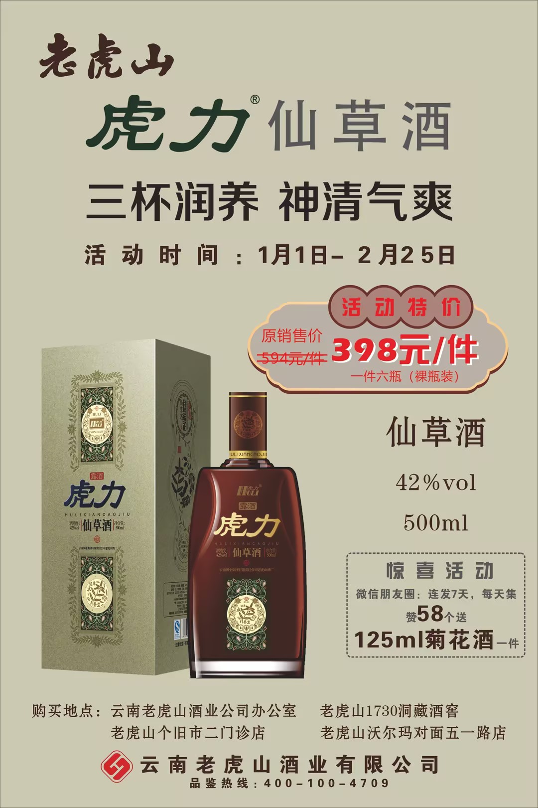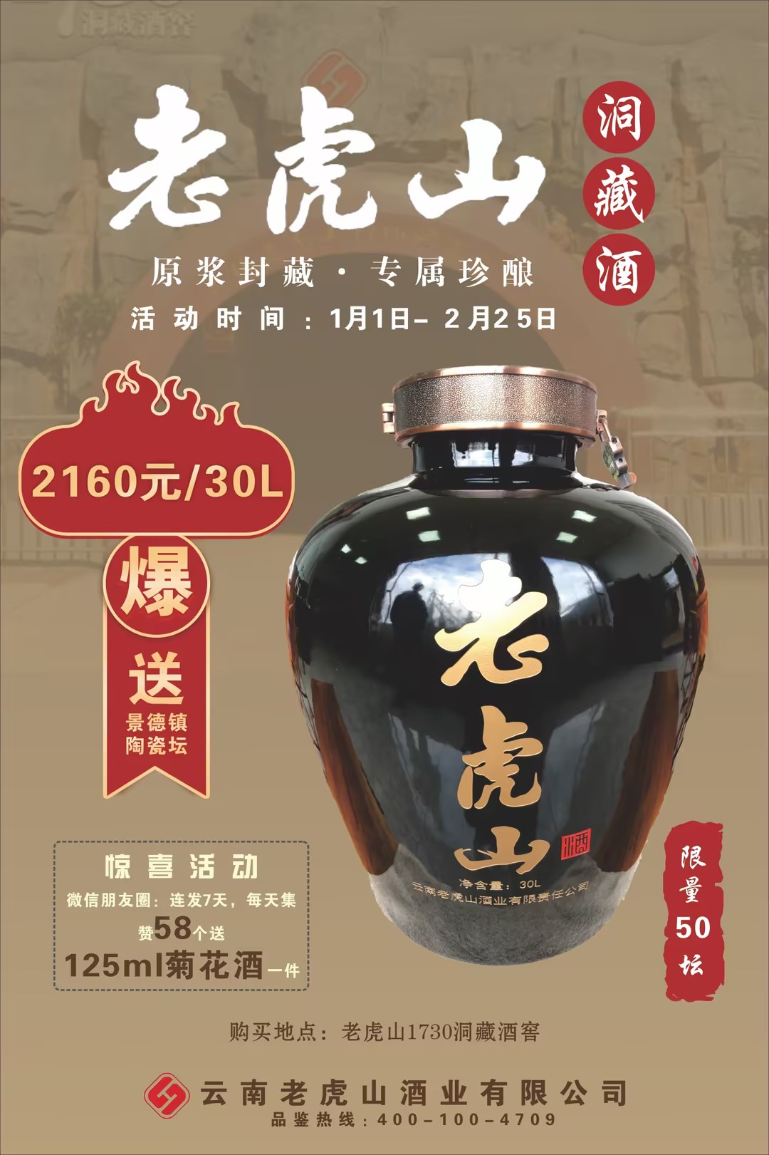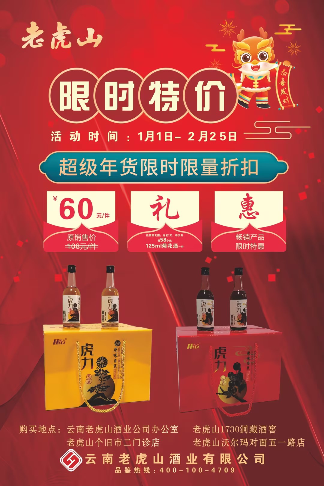 值此新春佳節(jié)即將到來之際,老虎山酒業(yè)為回饋新老顧客,特推出老虎山系列酒品優(yōu)惠活動(dòng)!口感醇厚,回味悠長,買即享折扣,更有好禮相送!