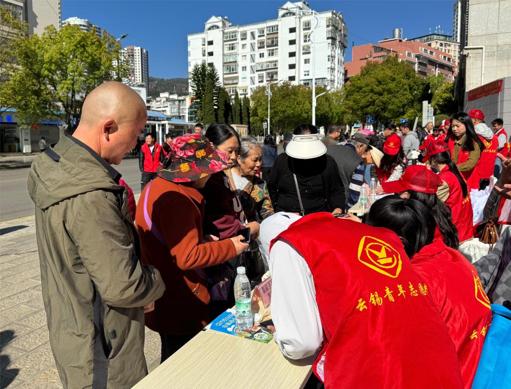 上午9時,錫文化墻前人頭攢動、熱鬧非凡,由各所屬團委召集的40名志愿者、提供的22個服務(wù)項目組成公益服務(wù)“集市”,吸引了不少市民前來“打卡”,耐心、熱情、優(yōu)質(zhì)的服務(wù)獲得廣大市民好評、點贊。健康檢測服務(wù)臺前,人來人往,大家有序排隊,迫不及待地想了解血糖、血壓、體重等情況。一旁的視力檢測服務(wù)也有不少市民駐足,志愿者們一邊進行檢測,一邊普及眼部保健知識。志愿者們不怕臟不怕累,熱心為過往的市民磨刀、擦皮鞋、洗眼鏡。多名年長的志愿者也加入到活動中,運用專業(yè)技術(shù)特長,為大家提供義剪、衣物縫補、寶石鑒定等服務(wù)。除了各種生活服務(wù)外,云錫“媛媛+”志愿服務(wù)隊還對云錫企業(yè)文化進行宣傳宣講。據(jù)統(tǒng)計,當(dāng)天服務(wù)市民約1200余人次。