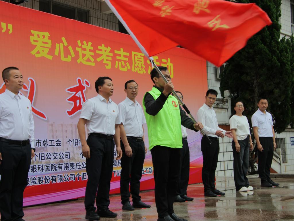 (啟動(dòng)儀式上,個(gè)舊市委副書(shū)記趙正田為“雷鋒”愛(ài)心送考志愿服務(wù)隊(duì)云錫志愿者代表羅文明授旗。)