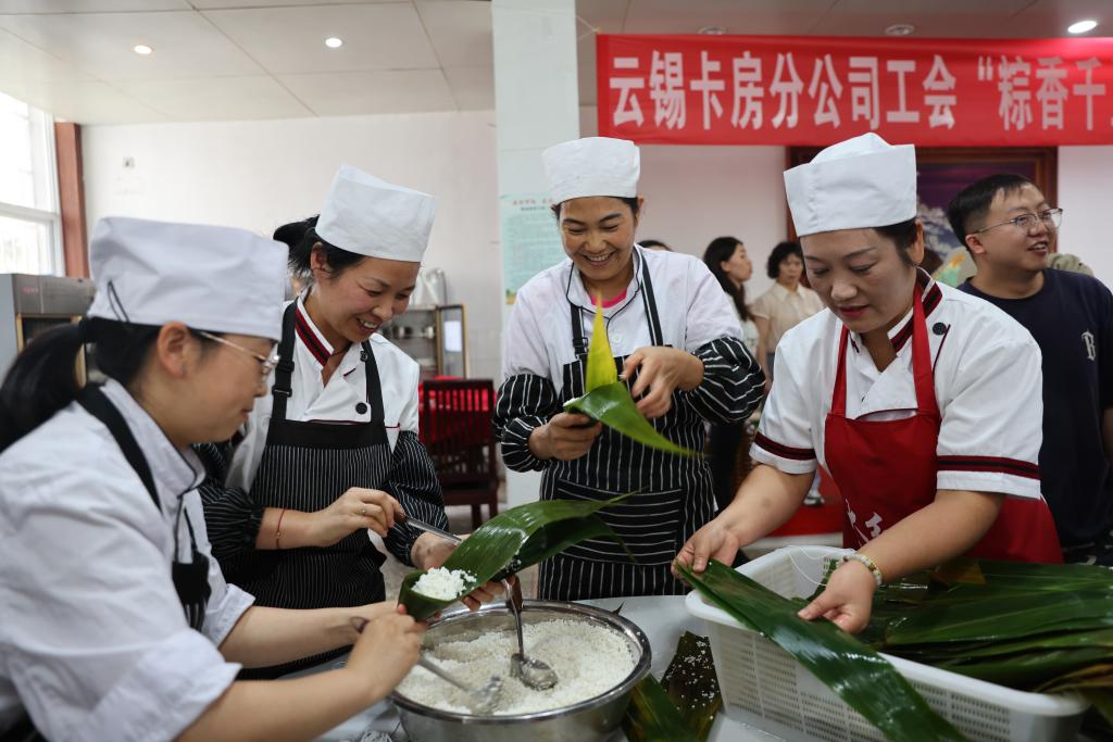 卡房分公司開展“粽香千里 情系卡房”端午節(jié)比賽活動。隨著計時口令的發(fā)出,大家雙手靈巧地舞動著,將糯米、粽葉巧妙地組合成一個個精致的粽子,在一場充滿激情的無聲較量中增進交流互動。(毛軒)