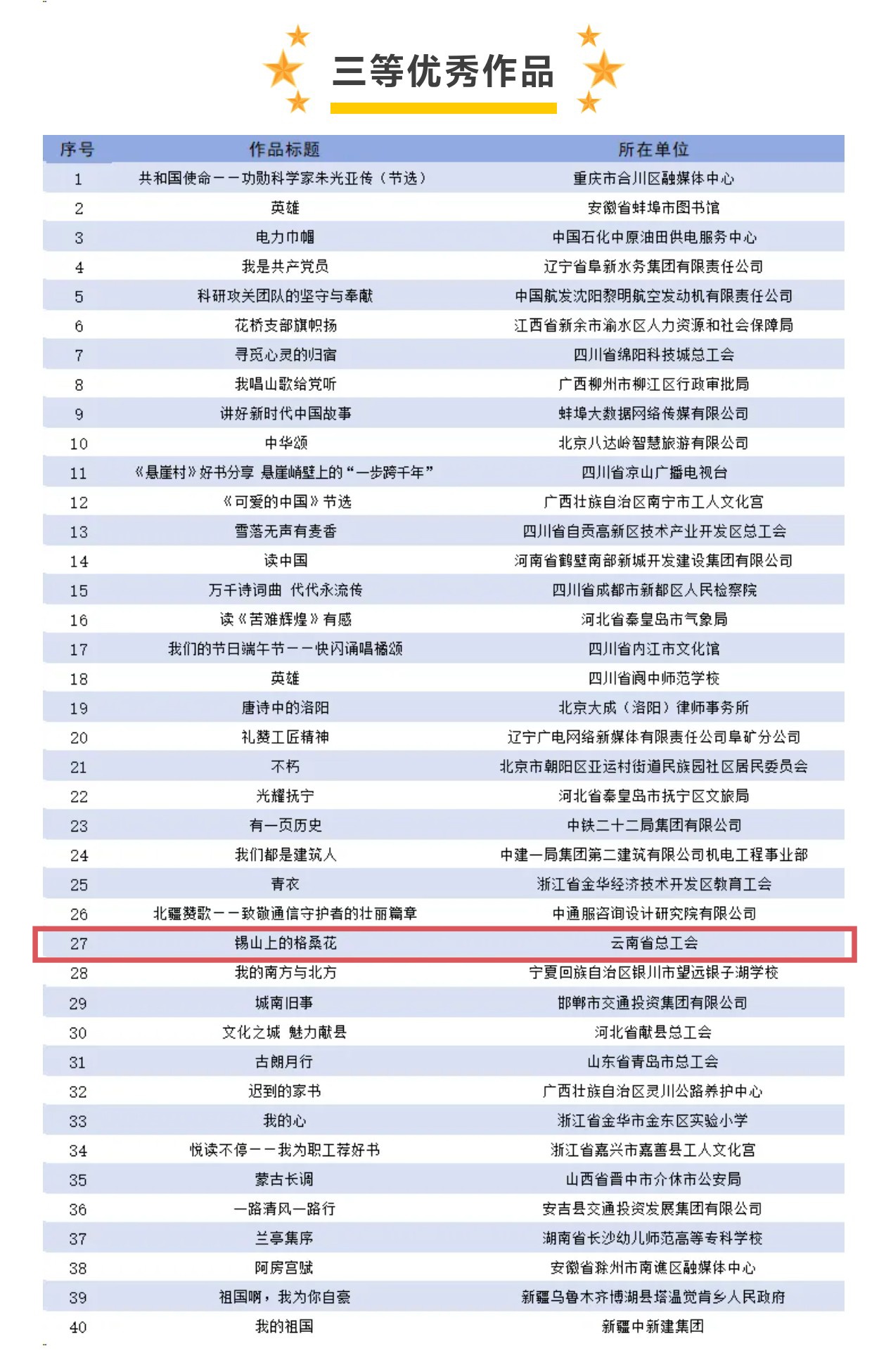 又訊:12月31日,全國(guó)總工會(huì)宣傳教育部公布“閱讀經(jīng)典好書 爭(zhēng)做中國(guó)好網(wǎng)民”主題誦讀活動(dòng)優(yōu)秀作品名單,全國(guó)共評(píng)選出優(yōu)秀誦讀作品90部,云南省有兩個(gè)作品入圍獲獎(jiǎng)名單,云錫工會(huì)選送的《錫山上的格桑花》榮獲全國(guó)主題活動(dòng)誦讀類作品三等獎(jiǎng)。