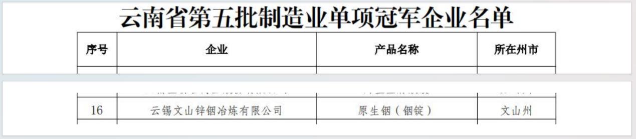 1月9日,云南省工業(yè)和信息化廳公布了第五批省制造業(yè)單項(xiàng)冠軍企業(yè)名單,文山鋅銦冶煉公司憑借在主導(dǎo)產(chǎn)品——原生銦(銦錠)領(lǐng)域的卓越貢獻(xiàn)與持續(xù)創(chuàng)新成功入選。