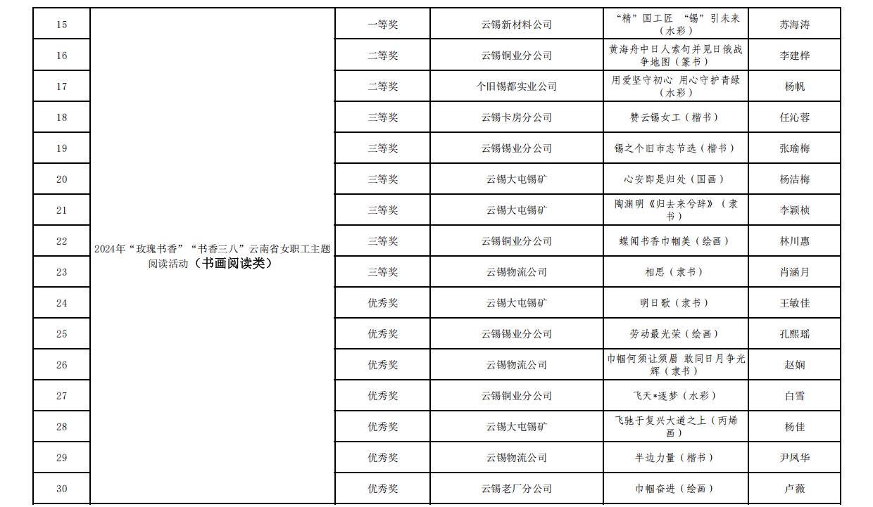 另悉,在云南省女職工主題閱讀活動中,控股公司工會共有45件作品分獲征文類、家書類、書畫類、攝影類、表演閱讀類的一、二、三等獎和優(yōu)秀獎。獲獎名單如下: