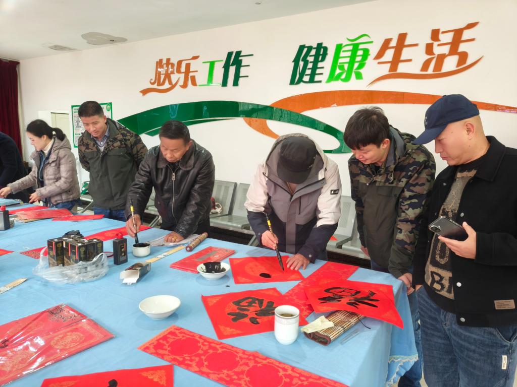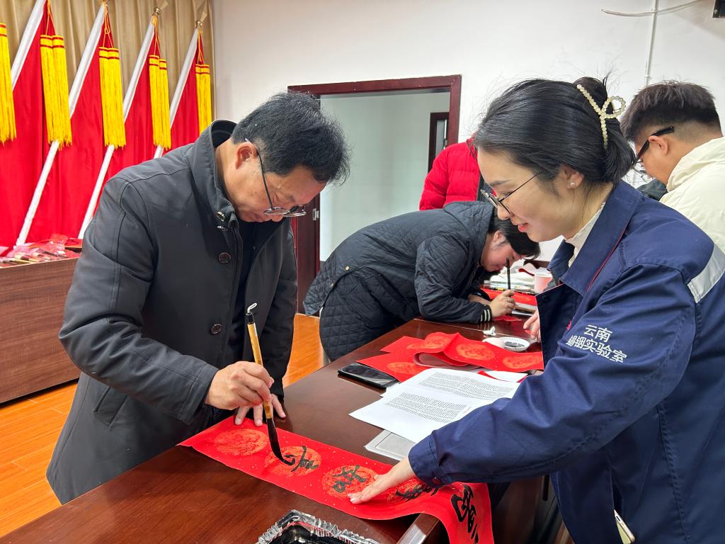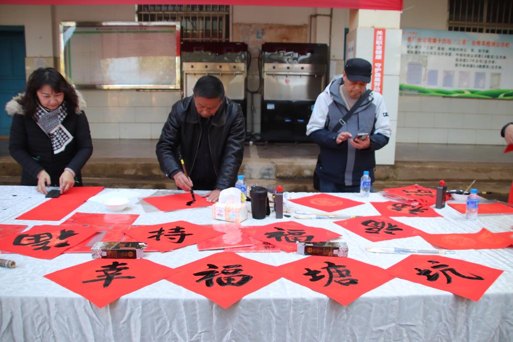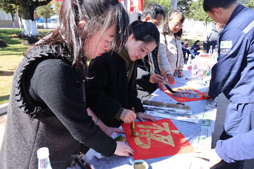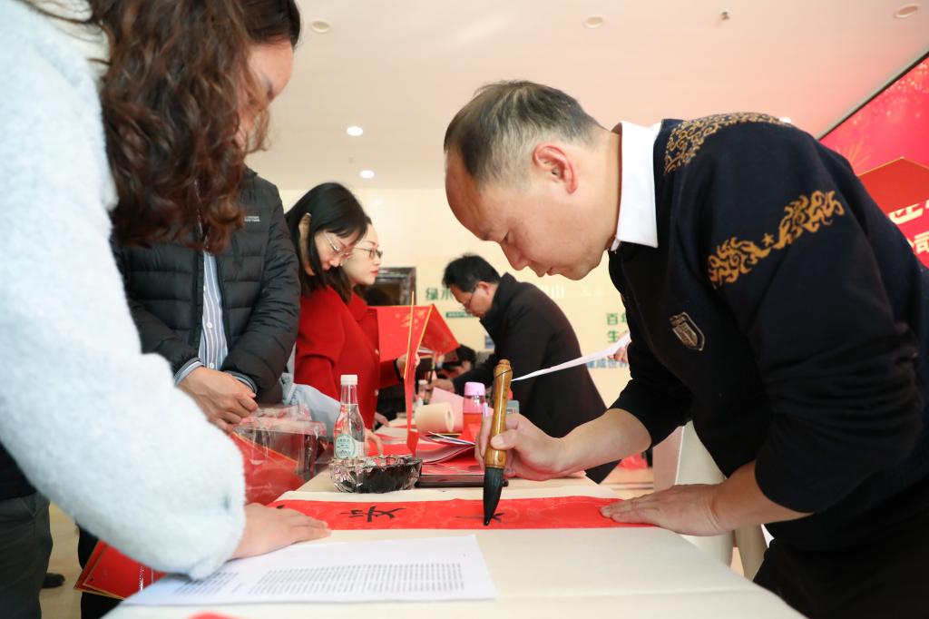 此次活動特別邀請中國書法家協(xié)會會員、紅河州書法家協(xié)會名譽主席段冰,云南省美術(shù)家協(xié)會會員、云錫文聯(lián)副主席楊雪峰等11名書法家進行現(xiàn)場創(chuàng)作。他們鋪開紅紙、凝神聚氣,以精湛的技藝揮毫潑墨、運筆如飛,書寫出一幅幅飽含美好祝福的春聯(lián)和“?!弊郑炎钫\摯的新春祝愿獻給干部職工。