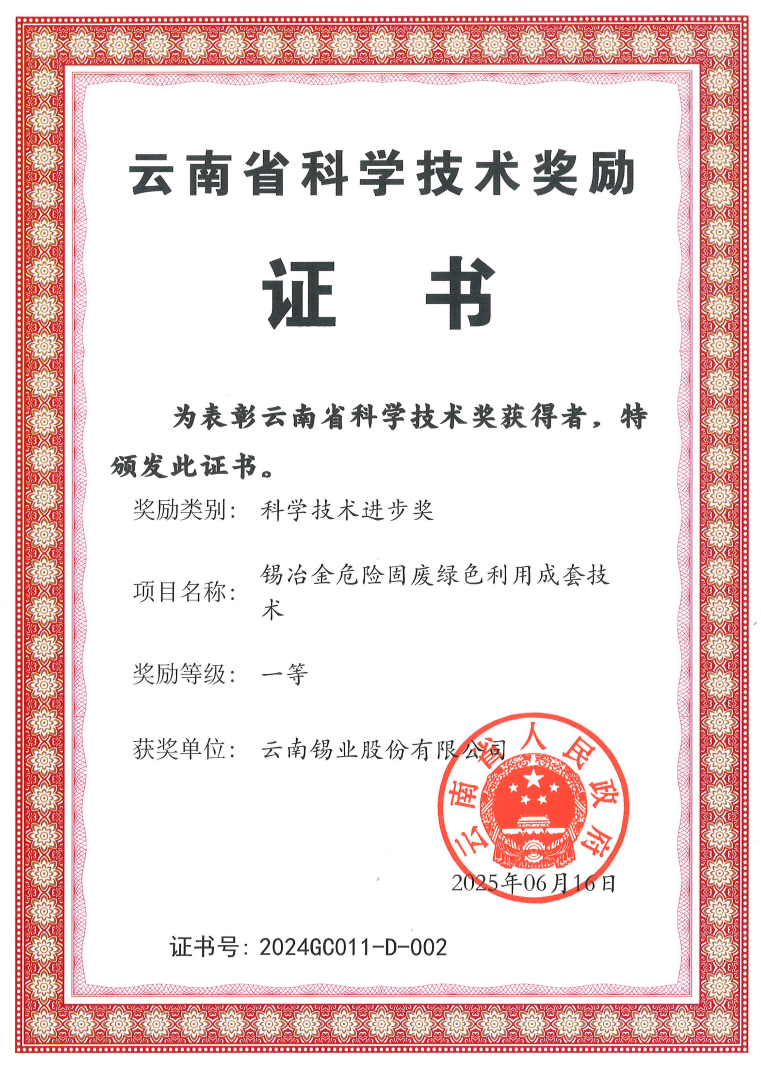 近日,2024年度云南省科學(xué)技術(shù)獎勵大會在昆明舉行。由昆明理工大學(xué)牽頭、錫業(yè)股份參與的“錫冶金危險固廢綠色利用成套技術(shù)”榮獲云南省科技進(jìn)步獎一等獎。