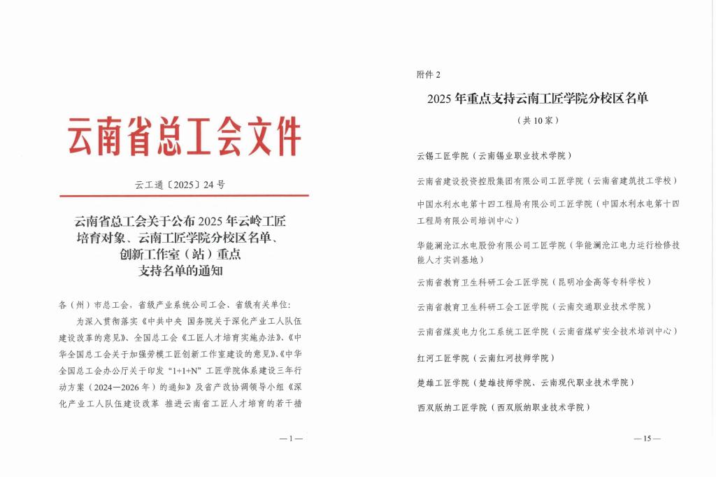 2025年12月29日,云南省總工會(huì)公布2025年云南工匠學(xué)院分校區(qū)名單,云錫工匠學(xué)院成功入選,成為全省獲重點(diǎn)支持的十家工匠學(xué)院之一。