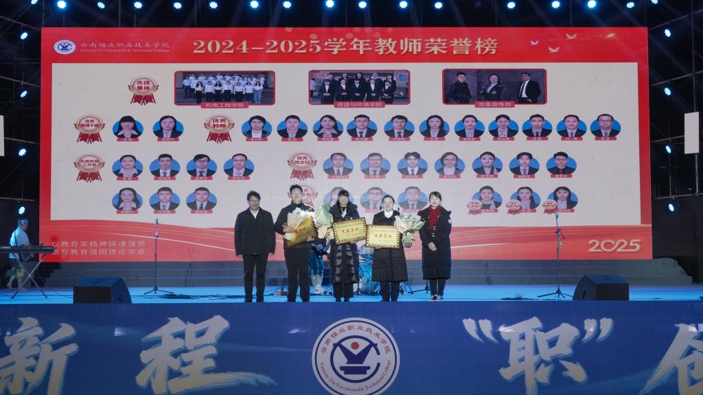 在熱烈的掌聲中,學(xué)院2024年度先進(jìn)集體、“最美教師”及2025年技能大賽獎(jiǎng)項(xiàng)逐一揭曉,宋興誠、吳君為學(xué)院2024年度先進(jìn)集體獲獎(jiǎng)代表頒獎(jiǎng)。