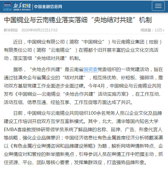 據(jù)悉,“央地合作共建”是云南省國(guó)資委黨委組織的一項(xiàng)黨建活動(dòng),旨在通過駐滇央企與省屬企業(yè)的“結(jié)對(duì)共建”,相互揚(yáng)優(yōu)勢(shì)、補(bǔ)短板、強(qiáng)弱項(xiàng),推動(dòng)雙方基層黨建工作全面進(jìn)步全面過硬。今年4月,中國(guó)銅業(yè)與云南錫業(yè)共同發(fā)布《中國(guó)銅業(yè)—云南錫業(yè)“央地合作共建”活動(dòng)實(shí)施方案》,在工作互動(dòng)、活動(dòng)互組、信息互通、經(jīng)驗(yàn)互享、工作互促等方面達(dá)成了共識(shí)。