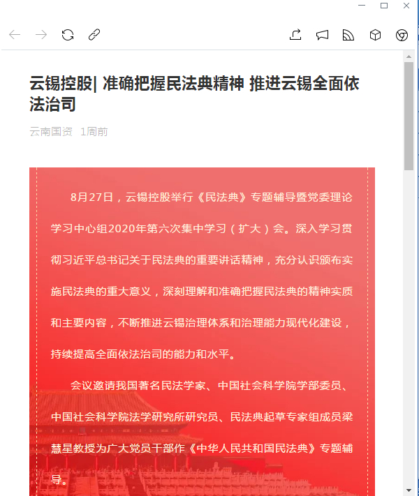 會議要求,要提高政治站位,深刻理解頒布實施民法典的重大意義。深刻理解民法典閃耀著習(xí)近平新時代中國特色社會主義思想的光芒,是新時代黨的創(chuàng)新理論在我國社會主義法治建設(shè)領(lǐng)域結(jié)出的碩果;深刻理解民法典堅持以人民為中心、體現(xiàn)人民至上,充分展現(xiàn)了我們黨為人民謀幸福的初心使命;深刻理解民法典蘊含中華傳統(tǒng)文化、飽含中華民族精神,弘揚了社會主義核心價值觀,集中體現(xiàn)了中國特色社會主義法律制度成果和制度自信;深刻理解把握民法典充分體現(xiàn)了社會主義市場經(jīng)濟的基本要求,進(jìn)一步完善了中國特色社會主義法治體系,是一部夯實法治基石的法典。要準(zhǔn)確宣傳宣講,營造學(xué)好守好用好民法典的濃厚氛圍。控股公司各級黨組織要認(rèn)真貫徹習(xí)近平總書記關(guān)于做好學(xué)習(xí)宣傳、普及推廣民法典工作的重要指示精神,切實扛起宣傳貫徹落實民法典的主體責(zé)任。要通過深入開展學(xué)習(xí)培訓(xùn)、專題宣講、普法宣傳,共同營造學(xué)習(xí)好、維護(hù)好、運用好民法典的濃厚社會氛圍,切實保障職工群眾的合法權(quán)益。要堅定貫徹落實,不斷深化推進(jìn)全面依法治司的具體實踐。控股公司各級黨組織要把堅定貫徹落實民法典作為“十四五”時期云錫法治建設(shè)的重點和決策、管理、監(jiān)督的重要標(biāo)尺,樹牢法治意識,強化法治思維,強化制度體系建設(shè),強化監(jiān)督執(zhí)紀(jì)問責(zé),強化法務(wù)隊伍建設(shè),提高運用法律知識依法經(jīng)營、依法治司和維護(hù)國有資產(chǎn)、維護(hù)職工利益、化解矛盾糾紛的能力和水平。