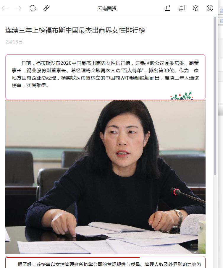 日前,福布斯發(fā)布2020中國(guó)最杰出商界女性排行榜,云錫控股公司黨委常委、副董事長(zhǎng),錫業(yè)股份副董事長(zhǎng)、總經(jīng)理?xiàng)钷让粼俅稳脒x“百人榜單”,排名第38位。作為一家地方國(guó)有企業(yè)總經(jīng)理,楊奕敏從巾幗林立的中國(guó)商界中頻頻脫穎而出,連續(xù)三年入選該榜單,實(shí)屬難得。?