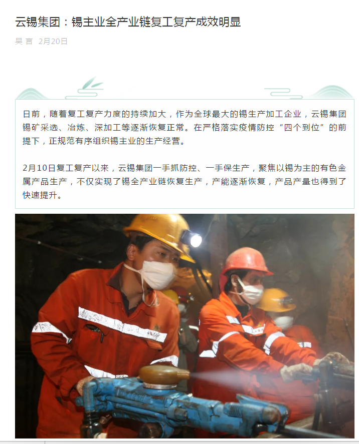 目前,云錫集團(tuán)錫產(chǎn)品國內(nèi)市場占有率為50%,國際市場占有率達(dá)20%,截至2019年云錫集團(tuán)精錫產(chǎn)量已連續(xù)15年居世界首位。集團(tuán)錫主業(yè)全產(chǎn)業(yè)鏈的復(fù)工復(fù)產(chǎn),對于國內(nèi)外錫產(chǎn)業(yè)鏈相關(guān)企業(yè)的穩(wěn)定運行將起到較好保障作用。