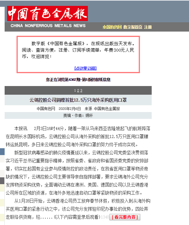 此次云錫控股公司從海外購買的12.5萬只醫(yī)用口罩將全部捐贈給省委省政府應對疫情工作領(lǐng)導小組指揮部,是迄今為止云南省屬國有企業(yè)從海外采購口罩捐贈數(shù)量最多的一筆。