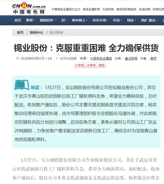 1月27日,寶山鋼鐵股份有限公司告知錫業(yè)股份公司,其位于武漢市青山區(qū)的武鋼新日鐵工廠錫粒原料告急,希望全力確保供應,及時配送。收到客戶通知后,股份公司本著支援武鋼就是支援武漢的態(tài)度,楊奕敏總經(jīng)理親自指揮協(xié)調(diào),由市場管理部積極與寶鋼股份溝通協(xié)調(diào),對此前既定的錫粒供應計劃進行調(diào)整,啟動應急方案,緊急從錫材公司昆山工廠發(fā)運20噸錫粒,力爭按客戶要求配送至武鋼新日鐵工廠,確保及時為寶鋼青山基地供應錫粒原料。