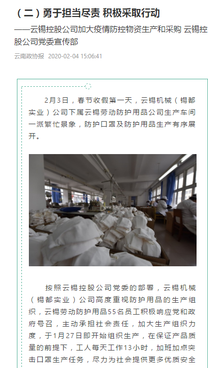 2月3日,春節(jié)收假第一天,云錫機(jī)械(錫都實(shí)業(yè))公司下屬云錫勞動(dòng)防護(hù)用品公司生產(chǎn)車間一派繁忙景象,防護(hù)口罩及防護(hù)用品生產(chǎn)有序展開。