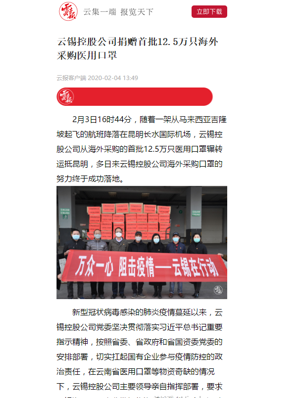 此次云錫控股公司從海外采購(gòu)的12.5萬(wàn)只醫(yī)用口罩將全部捐贈(zèng)給省委省政府應(yīng)對(duì)新型冠狀病毒感染肺炎疫情工作領(lǐng)導(dǎo)小組指揮部,是迄今為止云南省屬?lài)?guó)有企業(yè)從海外采購(gòu)口罩捐贈(zèng)數(shù)量最多的一筆。
