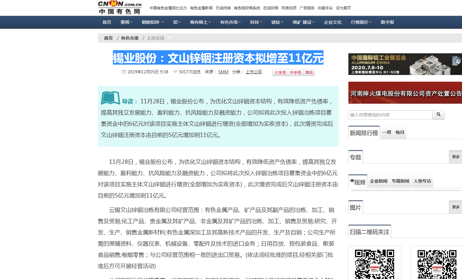 11月28日,錫業(yè)股份公布,為優(yōu)化文山鋅銦資本結(jié)構(gòu),有效降低資產(chǎn)負(fù)債率,提高其獨(dú)立發(fā)展能力、盈利能力、抗風(fēng)險(xiǎn)能力及融資能力,公司擬將此次投入鋅銦冶煉項(xiàng)目募集資金中的6億元對(duì)該項(xiàng)目實(shí)施主體文山鋅銦進(jìn)行增資(全部增加為實(shí)收資本),此次增資完成后文山鋅銦注冊(cè)資本由目前的5億元增加到11億元。