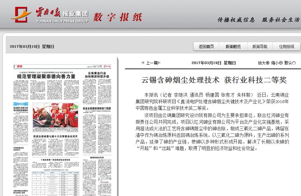 本報訊(記者 李繼洪 通訊員 楊建國 張有才 朱林毅) 近日,云南錫業(yè)集團(tuán)研究院科研項目《直流電爐處理含砷煙塵關(guān)鍵技術(shù)及產(chǎn)業(yè)化》榮獲2016年中國有色金屬工業(yè)科學(xué)技術(shù)獎二等獎。
