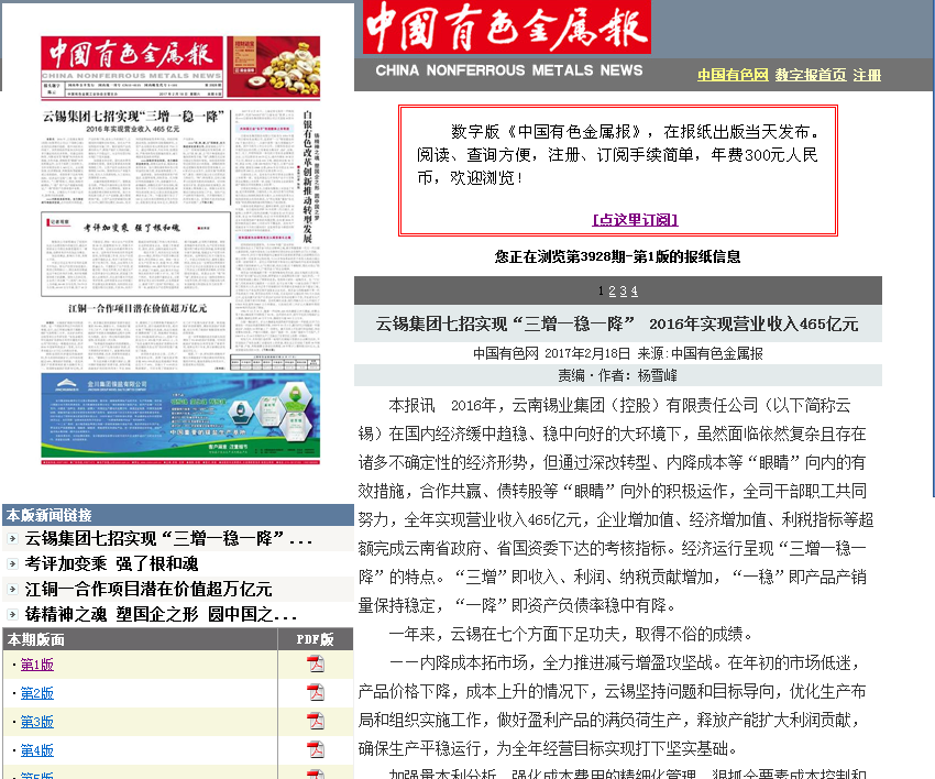 本報(bào)訊 2016年,云南錫業(yè)集團(tuán)(控股)有限責(zé)任公司(以下簡(jiǎn)稱云錫)在國(guó)內(nèi)經(jīng)濟(jì)緩中趨穩(wěn)、穩(wěn)中向好的大環(huán)境下,雖然面臨依然復(fù)雜且存在諸多不確定性的經(jīng)濟(jì)形勢(shì),但通過深改轉(zhuǎn)型、內(nèi)降成本等“眼睛”向內(nèi)的有效措施,合作共贏、債轉(zhuǎn)股等“眼睛”向外的積極運(yùn)作,全司干部職工共同努力,全年實(shí)現(xiàn)營(yíng)業(yè)收入465億元,企業(yè)增加值、經(jīng)濟(jì)增加值、利稅指標(biāo)等超額完成云南省政府、省國(guó)資委下達(dá)的考核指標(biāo)。經(jīng)濟(jì)運(yùn)行呈現(xiàn)“三增一穩(wěn)一降”的特點(diǎn)?!叭觥奔词杖?、利潤(rùn)、納稅貢獻(xiàn)增加,“一穩(wěn)”即產(chǎn)品產(chǎn)銷量保持穩(wěn)定,“一降”即資產(chǎn)負(fù)債率穩(wěn)中有降。 一年來(lái),云錫在七個(gè)方面下足功夫,取得不俗的成績(jī)。 ——內(nèi)降成本拓市場(chǎng),全力推進(jìn)減虧增盈攻堅(jiān)戰(zhàn)。在年初的市場(chǎng)低迷,產(chǎn)品價(jià)格下降,成本上升的情況下,云錫堅(jiān)持問題和目標(biāo)導(dǎo)向,優(yōu)化生產(chǎn)布局和組織實(shí)施工作,做好盈利產(chǎn)品的滿負(fù)荷生產(chǎn),釋放產(chǎn)能擴(kuò)大利潤(rùn)貢獻(xiàn),確保生產(chǎn)平穩(wěn)運(yùn)行,為全年經(jīng)營(yíng)目標(biāo)實(shí)現(xiàn)打下堅(jiān)實(shí)基礎(chǔ)。 加強(qiáng)量本利分析,強(qiáng)化成本費(fèi)用的精細(xì)化管理,狠抓全要素成本控制和降低工作,主營(yíng)產(chǎn)品作業(yè)成本比預(yù)算降低14.15%。圍繞勞動(dòng)生產(chǎn)率提升目標(biāo),優(yōu)化人力資源結(jié)構(gòu),人工成本比預(yù)算降低4.44%。 在融資極度困難情況下,置換高息負(fù)債,嚴(yán)格對(duì)外接待和公務(wù)用車管理,財(cái)務(wù)費(fèi)用、三公經(jīng)費(fèi)降低。緊抓有色金屬價(jià)格反彈的有利時(shí)機(jī),加大市場(chǎng)拓展力度,擴(kuò)大產(chǎn)品銷量,最大限度釋放產(chǎn)能,主營(yíng)產(chǎn)品內(nèi)貿(mào)銷量同比增長(zhǎng)9.17%,銷價(jià)同比增長(zhǎng)24.66%。充分利用套期保值等多種手段,防控價(jià)格波動(dòng)風(fēng)險(xiǎn)。加強(qiáng)原料采購(gòu)策略研究,主營(yíng)產(chǎn)品采購(gòu)價(jià)差比預(yù)算創(chuàng)效7710萬(wàn)元。通過內(nèi)降成本、外拓市場(chǎng)、挖潛創(chuàng)效、嚴(yán)格考核等攻堅(jiān)措施的落實(shí),減虧增盈攻堅(jiān)戰(zhàn)收效明顯。 ——多措并舉出實(shí)招,全力確保資金鏈安全。清理沉淀資金,提高資金使用效率。加大債權(quán)清收和存貨占用資金的壓縮力度,資金流轉(zhuǎn)速度上升。 盤清家底,加快閑置低效資產(chǎn)的盤活、處置和變現(xiàn),回收資金。扎實(shí)做好傳統(tǒng)間接融資工作,創(chuàng)新融資方式,新增融資。調(diào)整優(yōu)化資產(chǎn)資本結(jié)構(gòu),降低負(fù)債率。千方百計(jì)搶抓政策機(jī)遇,順利完成首批22億元國(guó)企深改基金轉(zhuǎn)增資本金工作。與建設(shè)銀行簽訂了100億元的市場(chǎng)化債轉(zhuǎn)股系列合作協(xié)議,首批到位資金22.5億元,降低資產(chǎn)負(fù)債率。 ——“調(diào)、轉(zhuǎn)、破、立”四維度,全力推進(jìn)深化改革工作。緊緊圍繞公司“十三五”發(fā)展規(guī)劃確定的發(fā)展思路、目標(biāo),從“調(diào)、轉(zhuǎn)、破、立”四個(gè)維度推進(jìn)實(shí)施深改轉(zhuǎn)型方案。“調(diào)”:調(diào)整優(yōu)化總部功能定位和組織架構(gòu),加快投資控股型總部頂層設(shè)計(jì)的落地。調(diào)整扭轉(zhuǎn)傳統(tǒng)過度集權(quán)攬事的經(jīng)營(yíng)管控模式,以6家試點(diǎn)企業(yè)先行,全面實(shí)施“松綁放權(quán)”,激發(fā)二級(jí)單位獨(dú)立自主經(jīng)營(yíng)的活力和動(dòng)力。“轉(zhuǎn)”:轉(zhuǎn)變觀念,總結(jié)云錫多元化投資失敗的深刻教訓(xùn),切實(shí)轉(zhuǎn)變盲目擴(kuò)張、冒進(jìn)投資的發(fā)展觀念,將發(fā)展重心聚焦錫主業(yè),將錫主業(yè)的發(fā)展動(dòng)力鎖定在深加工產(chǎn)業(yè)。加快產(chǎn)品產(chǎn)業(yè)轉(zhuǎn)型升級(jí)步伐,召開錫材錫化工改革發(fā)展大會(huì),依靠技術(shù)進(jìn)步加快新產(chǎn)品市場(chǎng)推廣,推動(dòng)云錫產(chǎn)品產(chǎn)業(yè)從產(chǎn)業(yè)鏈低端向高技術(shù)含量、高附加值轉(zhuǎn)型升級(jí)?!捌啤保捍蚱仆悩I(yè)務(wù)管理分散和低效的局面,圍繞集約化協(xié)同發(fā)展的目標(biāo),實(shí)施了錫業(yè)股份個(gè)舊東部礦山采選一體化改革,完成了廣元公司與大酒店的整合。破冰產(chǎn)銷脫節(jié)的痼疾,按產(chǎn)購(gòu)銷一體化格局,推進(jìn)營(yíng)銷體系改革。突破體制機(jī)制的束縛,加大三項(xiàng)制度改革力度,大力推進(jìn)控股公司總部新一輪的“三定”和薪酬考核體系改革?!傲ⅰ保簢@控股公司產(chǎn)業(yè)培育目標(biāo),改制成立了物流公司、研究院公司和前海融資租賃公司并有序開展業(yè)務(wù),為云錫貿(mào)易金融業(yè)務(wù)和科技服務(wù)產(chǎn)業(yè)打下了良好基礎(chǔ)。 ——責(zé)任擔(dān)當(dāng)勇作為,全力化解風(fēng)險(xiǎn)和處置歷史遺留問題。群策群力,艱苦博弈,據(jù)理力爭(zhēng),積極推進(jìn)房