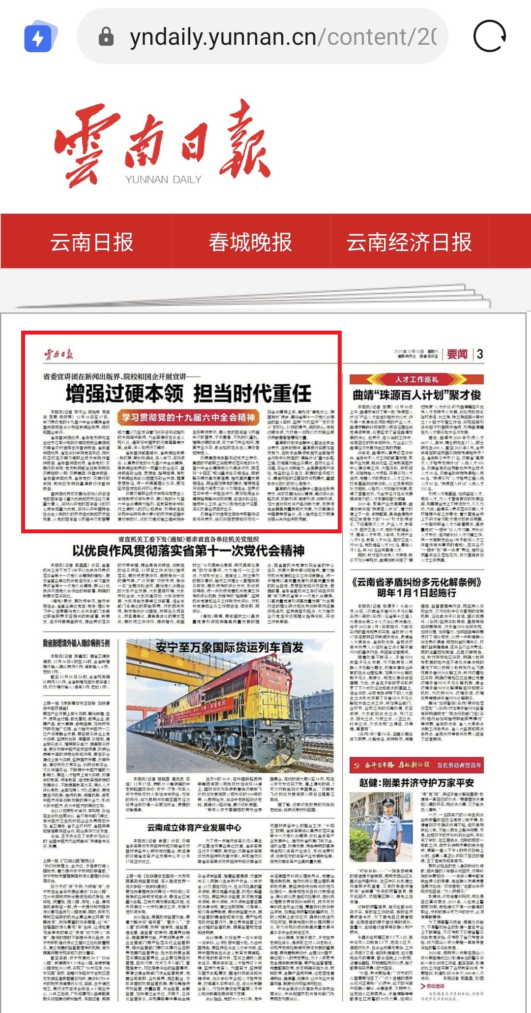 省委宣講團成員、省委黨史研究室主任蘇紅軍分別到云南日報報業(yè)集團和云南省農(nóng)村信用社作宣講報告。省委宣講團成員,省社會科學(xué)院黨組書記、院長楊正權(quán)在云南交通職業(yè)技術(shù)學(xué)院作宣講報告。省委宣講團成員、省委黨校(云南行政學(xué)院)黨史教研部主任熊黎明到云錫控股公司(云錫集團)作宣講報告。省委宣講團成員、省委黨校(云南行政學(xué)院)教授歐黎明到富滇銀行作宣講報告。