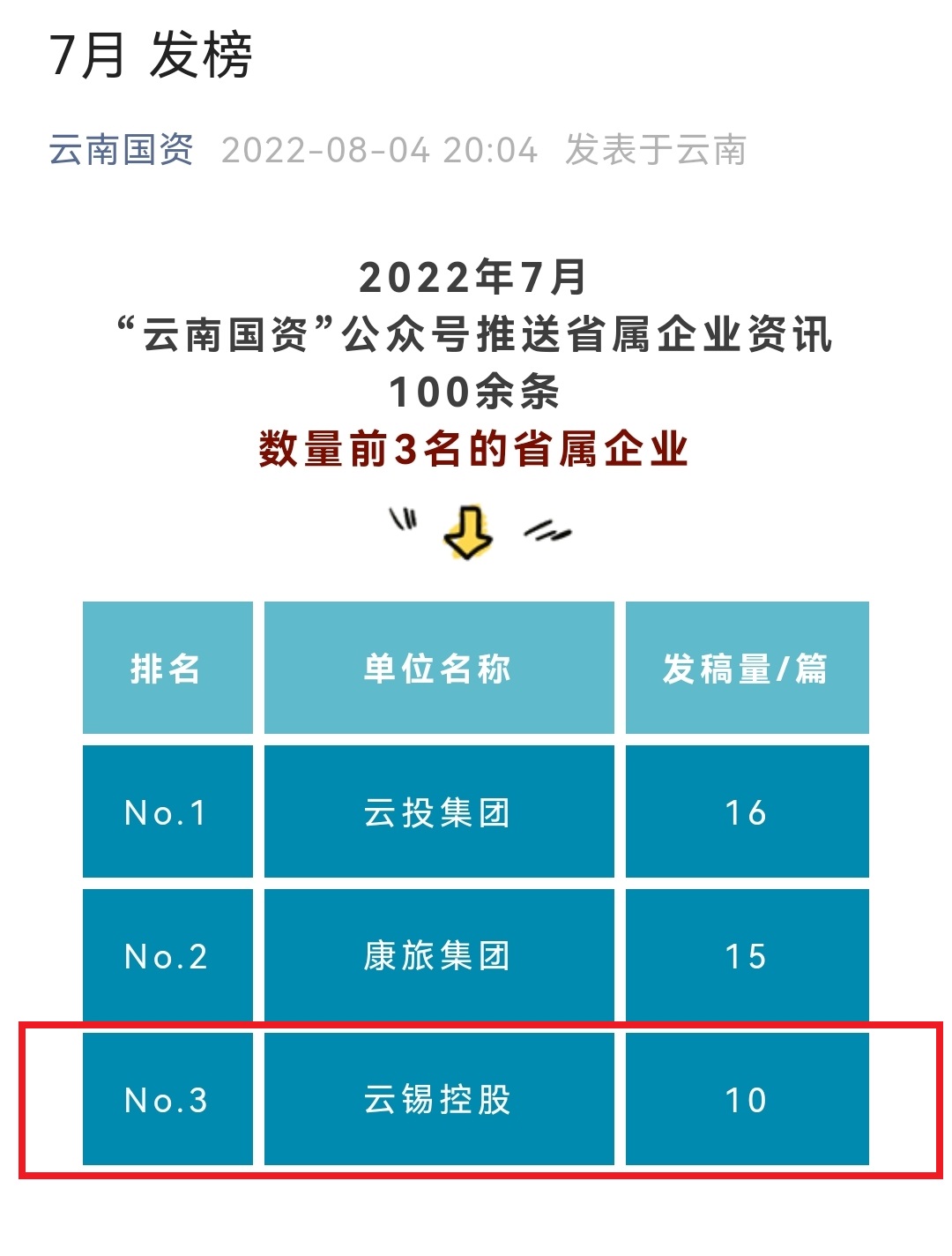 7月,控股公司創(chuàng)新宣傳工作方式方法,緊緊圍繞生產(chǎn)經(jīng)營、改革發(fā)展、黨建品牌等重點工作講好云錫故事,向政府、金融機(jī)構(gòu)等傳遞了云錫好聲音,好經(jīng)驗,新聞輿論傳播力、引導(dǎo)力、影響力、公信力進(jìn)一步提升,在云南國資發(fā)布的發(fā)稿量榜單中進(jìn)入前三。