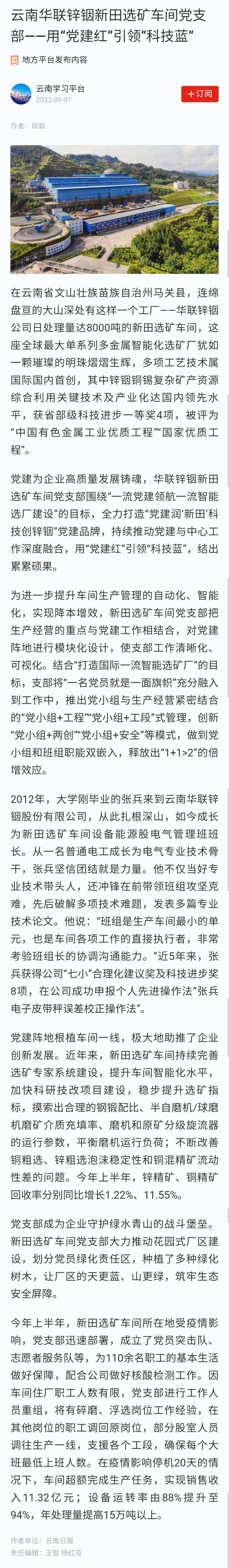 學(xué)習(xí)強(qiáng)國(guó):云南華聯(lián)鋅銦新田選礦車間黨支部——用“黨建紅”引領(lǐng)“科技藍(lán)”