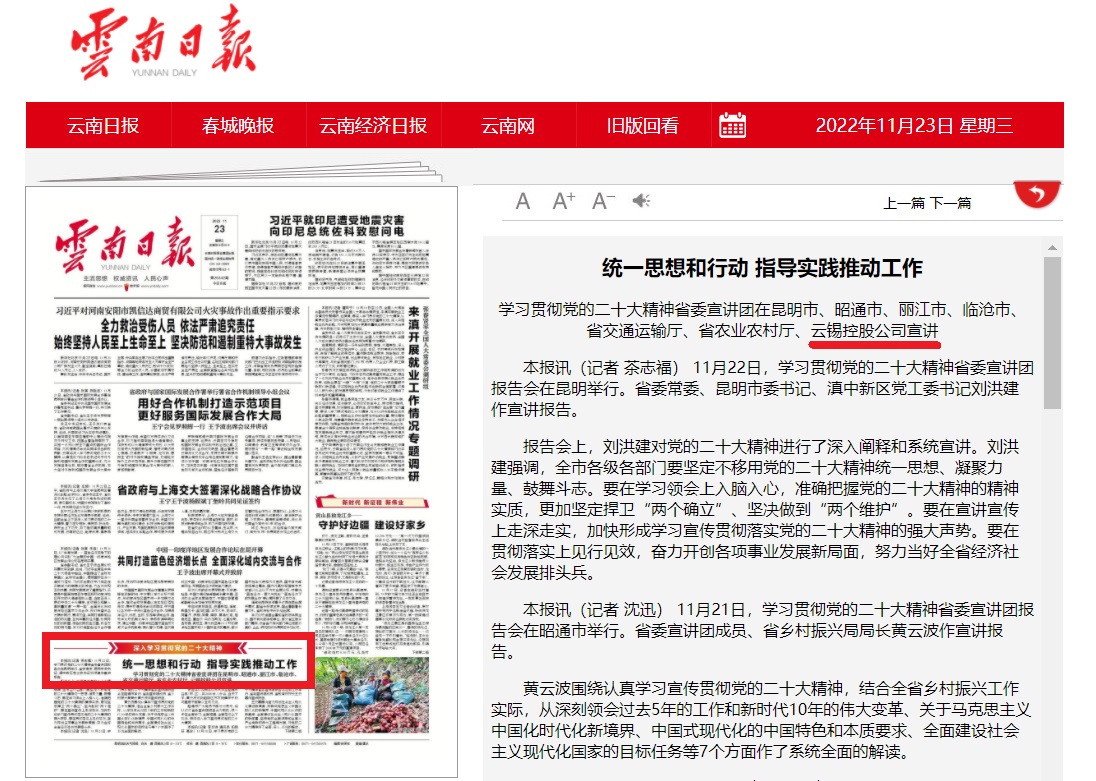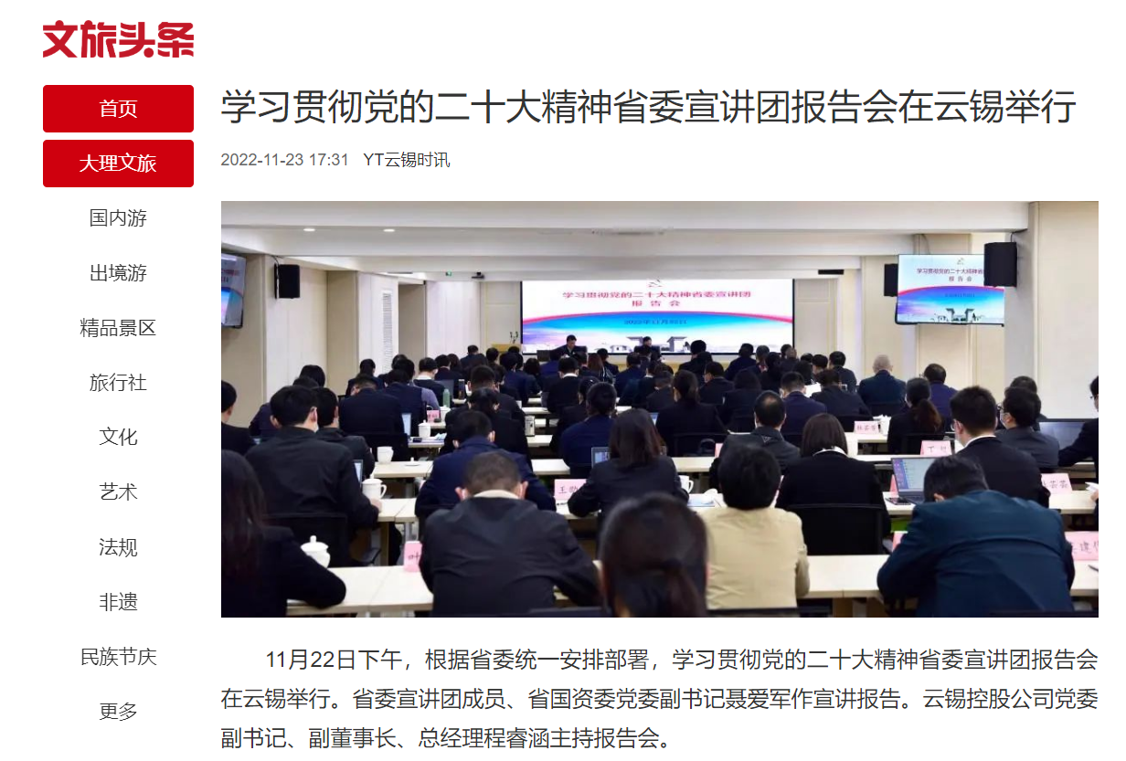 本報訊(記者 李繼洪) 11月22日,學(xué)習(xí)貫徹黨的二十大精神省委宣講團報告會在云錫控股公司舉行。省委宣講團成員、省國資委黨委副書記聶愛軍作宣講報告。