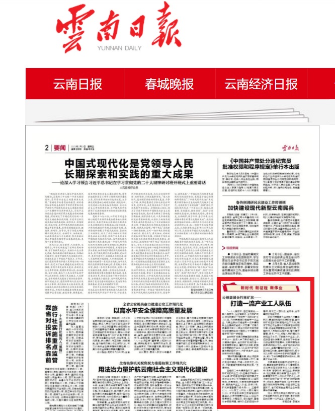 云錫集團黨委副書記姚家立介紹,集團黨委把黨的二十大精神扎扎實實貫徹落實到技術(shù)工人隊伍建設(shè)中,聚焦“思想引領(lǐng)、建功立業(yè)、素質(zhì)提升、地位提高、服務(wù)保障”五大任務(wù),不斷厚植技術(shù)工人成長成才的沃土,許多職工實現(xiàn)了由“工”變“匠”的技能提升。近年來,集團先后有3名專家享受國務(wù)院政府特殊津貼,近百名職工在國家級、省級和有色金屬行業(yè)各類競賽中獲得榮譽。
