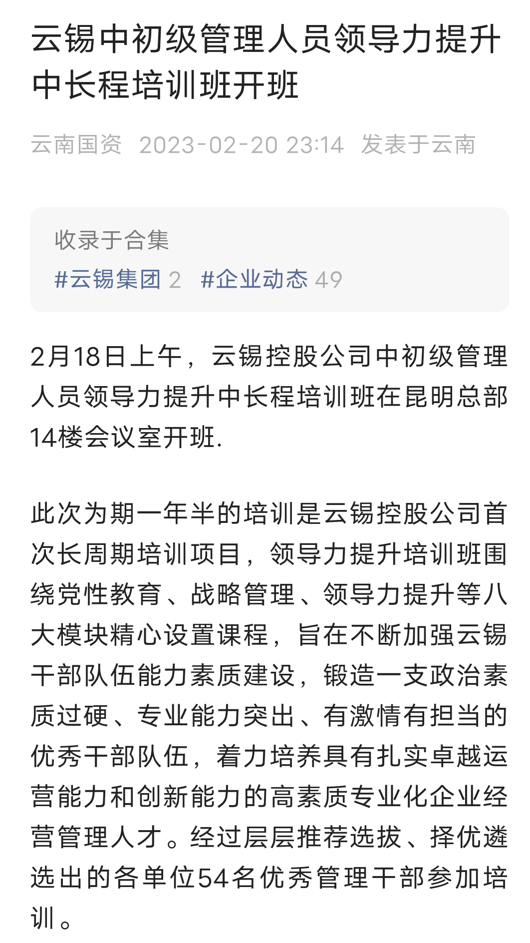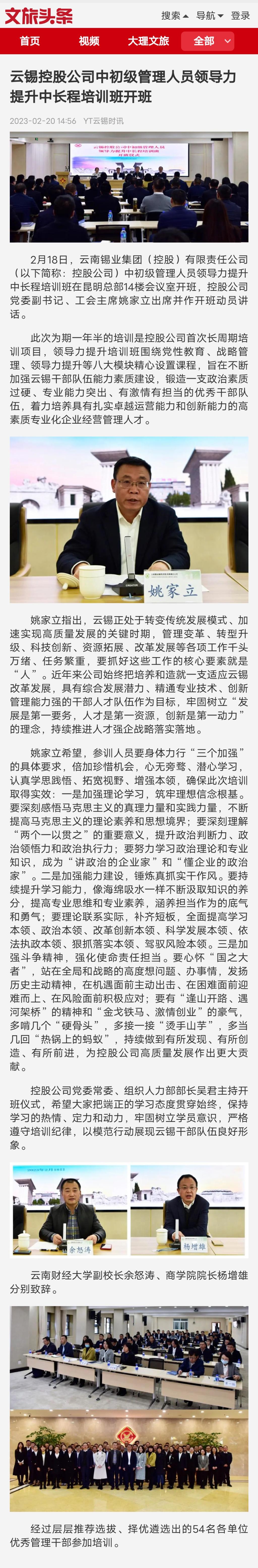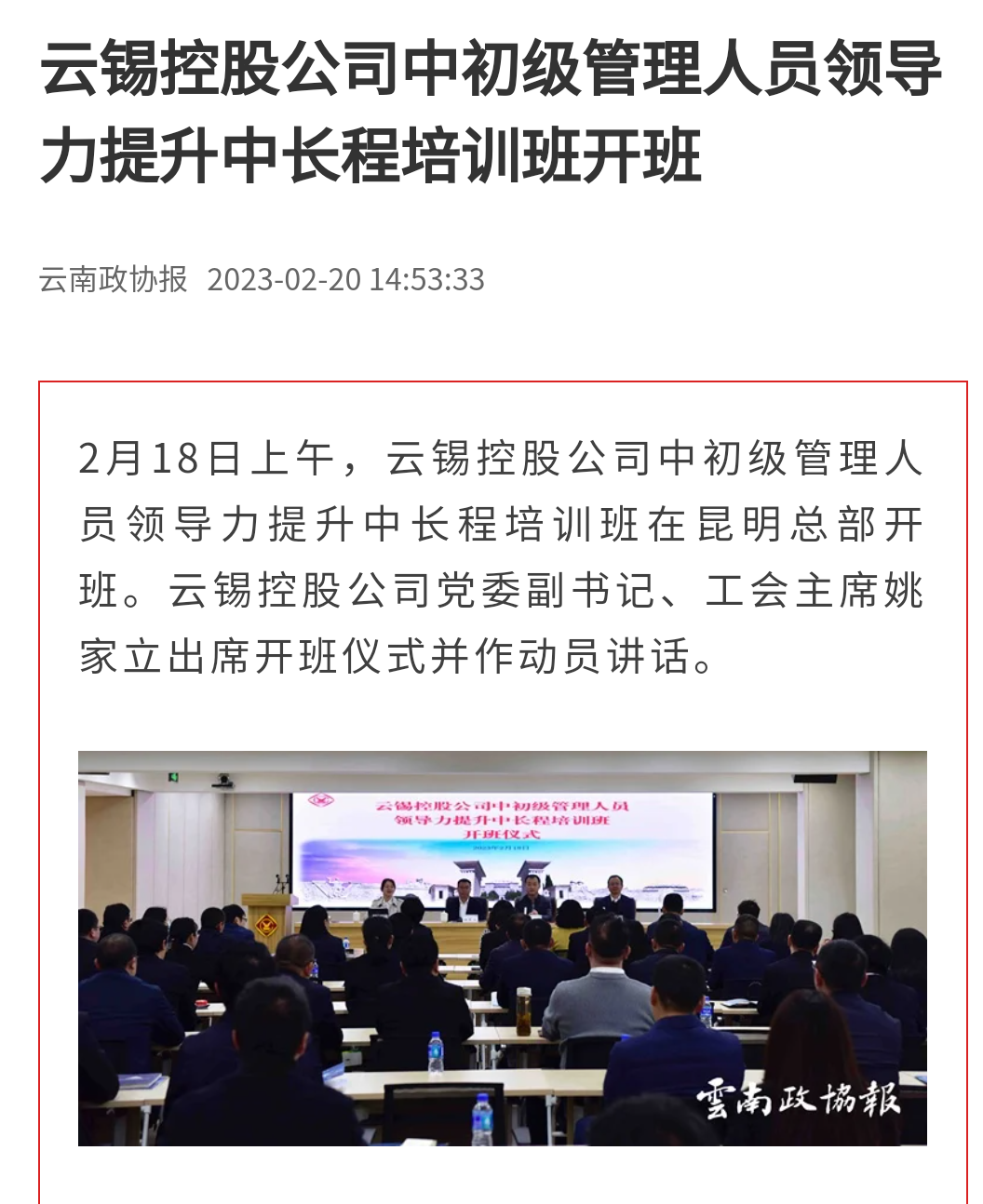 云南國(guó)資、云南政協(xié)報(bào)、中國(guó)有色金屬報(bào)、文旅頭條:云錫控股公司中初級(jí)管理人員領(lǐng)導(dǎo)力提升中長(zhǎng)程培訓(xùn)班開班