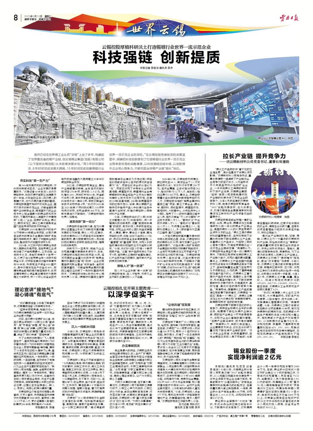 雖然已經(jīng)在世界錫工業(yè)頭把“交椅”上坐了多年,構(gòu)建起了世界最完備的錫產(chǎn)業(yè)鏈,但云南錫業(yè)集團(tuán)(控股)有限公司(以下簡稱云錫控股)從未放緩發(fā)展步伐?!坝?年時間強(qiáng)攻關(guān),8年時間完成發(fā)展大跨越,15年時間創(chuàng)建錫銦行業(yè)世界一流示范企業(yè)的目標(biāo)?!痹谠棋a控股黨委制定的“3815”發(fā)展藍(lán)圖中,明確把科技創(chuàng)新提到了打造錫銦行業(yè)世界一流示范企業(yè)競爭新優(yōu)勢的戰(zhàn)略高度,以科技強(qiáng)鏈延鏈補(bǔ)鏈,以創(chuàng)新提升企業(yè)核心競爭力,不斷鞏固全球錫產(chǎn)業(yè)鏈“鏈長”地位。