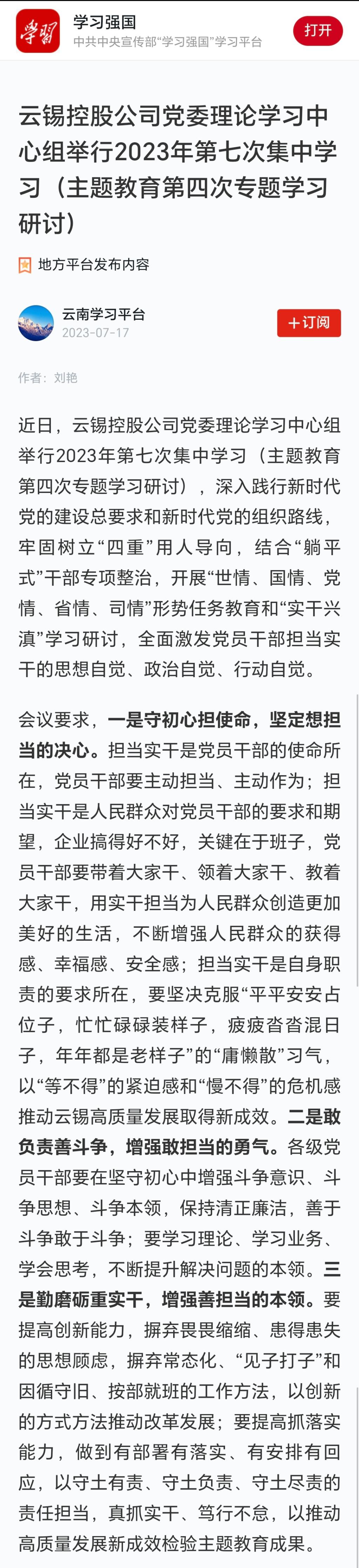 學(xué)習(xí)強(qiáng)國(guó):云錫控股公司黨委理論學(xué)習(xí)中心組舉行2023年第七次集中學(xué)習(xí)(主題教育第四次專題學(xué)習(xí)研討)
