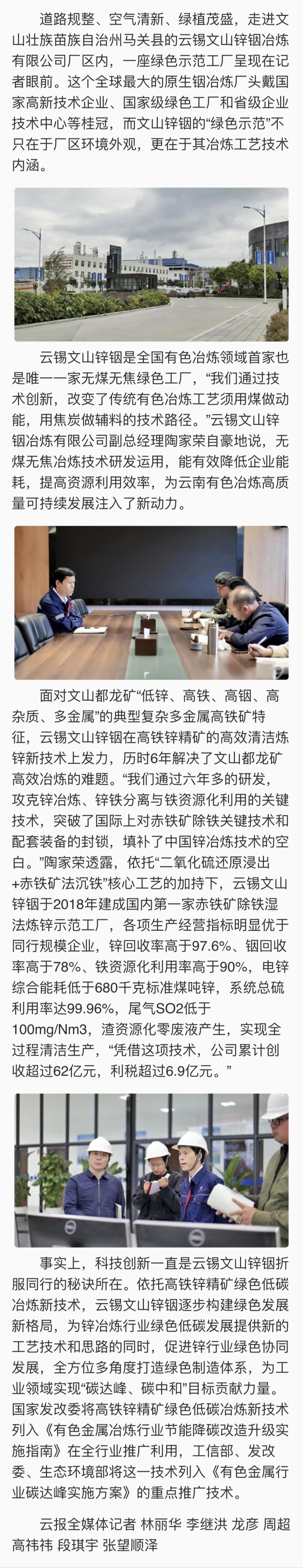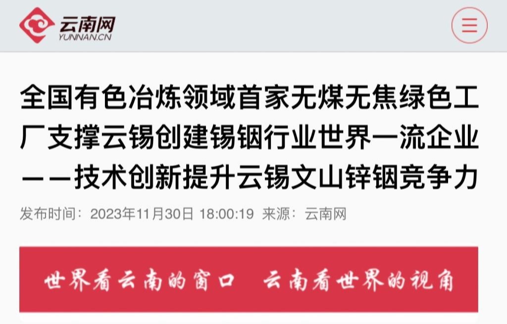 云南網(wǎng):全國(guó)有色冶煉領(lǐng)域首家無(wú)煤無(wú)焦綠色工廠支撐云錫創(chuàng)建錫銦行業(yè)世界一流企業(yè)——技術(shù)創(chuàng)新提升云錫文山鋅銦競(jìng)爭(zhēng)力