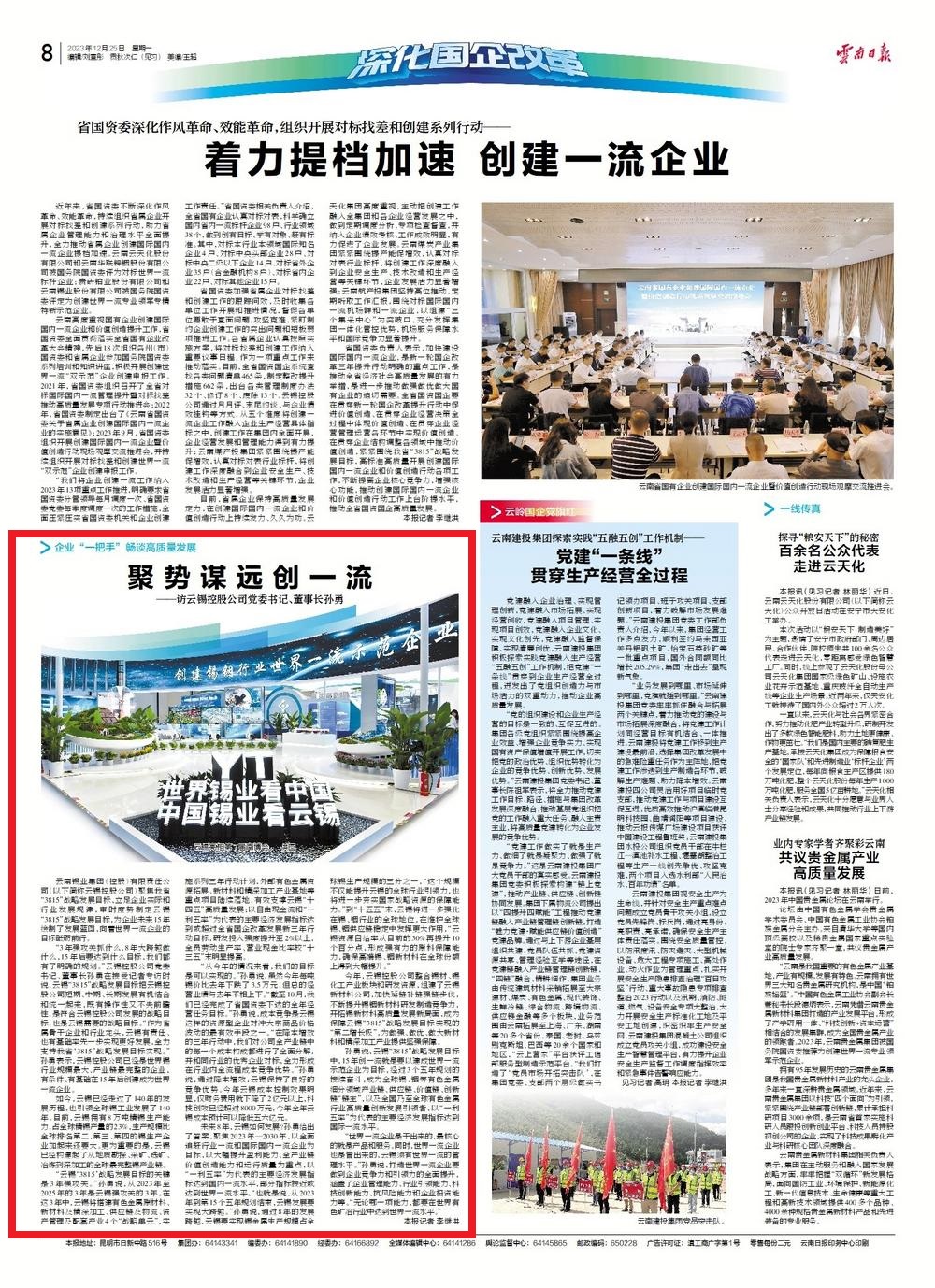 云南錫業(yè)集團(控股)有限責任公司(以下簡稱云錫控股公司)聚焦我省“3815”戰(zhàn)略發(fā)展目標,立足企業(yè)實際和行業(yè)發(fā)展規(guī)律,審時度勢制定云錫“3815”戰(zhàn)略發(fā)展目標,為企業(yè)未來15年繪制了發(fā)展藍圖,向著世界一流企業(yè)的目標砥礪前行。