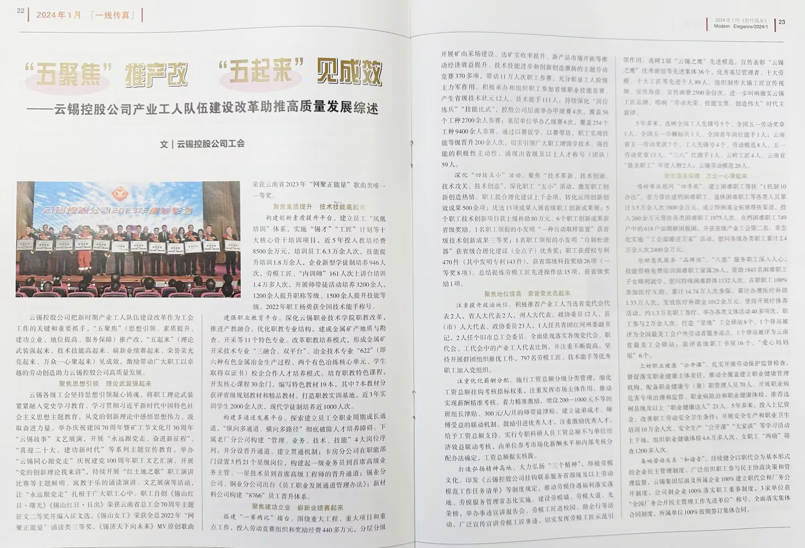 云錫控股公司深入貫徹落實新時期產(chǎn)業(yè)工人隊伍建設(shè)改革要求,把新時期產(chǎn)業(yè)工人隊伍建設(shè)改革作為工會工作的關(guān)鍵和重要抓手,“五聚焦”(思想引領(lǐng)、素質(zhì)提升、建功立業(yè)、地位提高、服務(wù)保障)推產(chǎn)改,“五起來”(理論武裝強起來、技術(shù)技能高起來、嶄新業(yè)績賽起來、榮譽榮光亮起來、萬眾一心聚起來)見成效,激勵帶動廣大職工以卓越的勞動創(chuàng)造助力云錫高質(zhì)量發(fā)展。