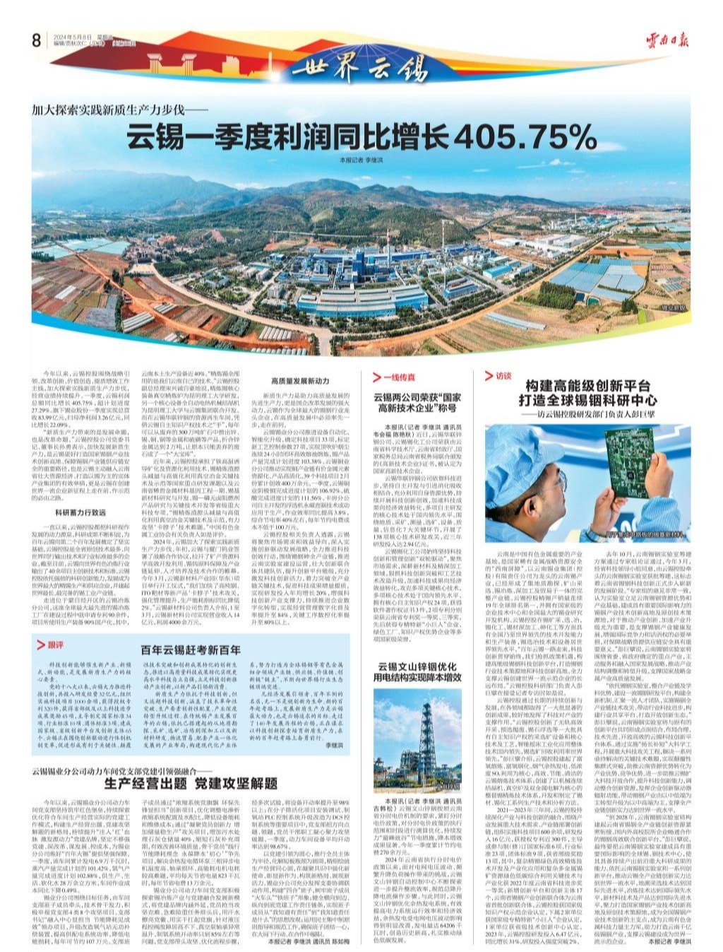 今年以來,云錫控股圍繞戰(zhàn)略引領(lǐng)、改革創(chuàng)新、價值創(chuàng)造、提質(zhì)增效工作主線,加大探索實踐新質(zhì)生產(chǎn)力步伐,經(jīng)營業(yè)績持續(xù)提升。一季度,云錫利潤總額同比增長405.75%,超計劃進度27.29%。旗下錫業(yè)股份實現(xiàn)總營收83.99億元,歸母凈利潤3.26億元,同比增長22.09%。