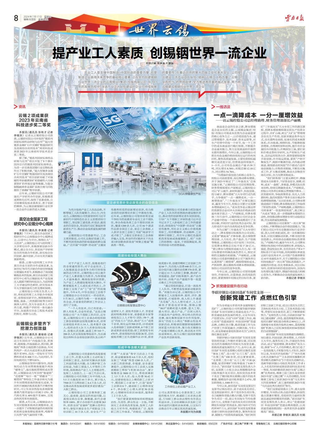 “通過黨組織建設(shè),打造一流技術(shù)工人隊(duì)伍,不斷塑造發(fā)展新動(dòng)能新優(yōu)勢(shì)?!眲⒖「嬖V記者,云錫控股公司不斷健全工人技能培養(yǎng)、使用、評(píng)價(jià)、激勵(lì)制度,打破職稱、收入和上升通道“天花板”,為人人皆可成才、人人盡展其才營造良好環(huán)境。圍繞云錫“3815”戰(zhàn)略和重大戰(zhàn)略、重大工程、重大項(xiàng)目、重點(diǎn)產(chǎn)業(yè),廣泛深入持久開展具有產(chǎn)業(yè)特色、單位特點(diǎn)的勞動(dòng)競(jìng)賽,強(qiáng)化集智創(chuàng)新平臺(tái)作用發(fā)揮,深化“四技五小兩比”等群眾性技術(shù)創(chuàng)新活動(dòng),積極承擔(dān)錫銦領(lǐng)域戰(zhàn)略性國家重大科技任務(wù),聚力攻關(guān)錫銦全產(chǎn)業(yè)鏈關(guān)鍵核心技術(shù),推動(dòng)高水平科技成果轉(zhuǎn)化,助力云錫打造國家錫銦產(chǎn)業(yè)技術(shù)創(chuàng)新高地。