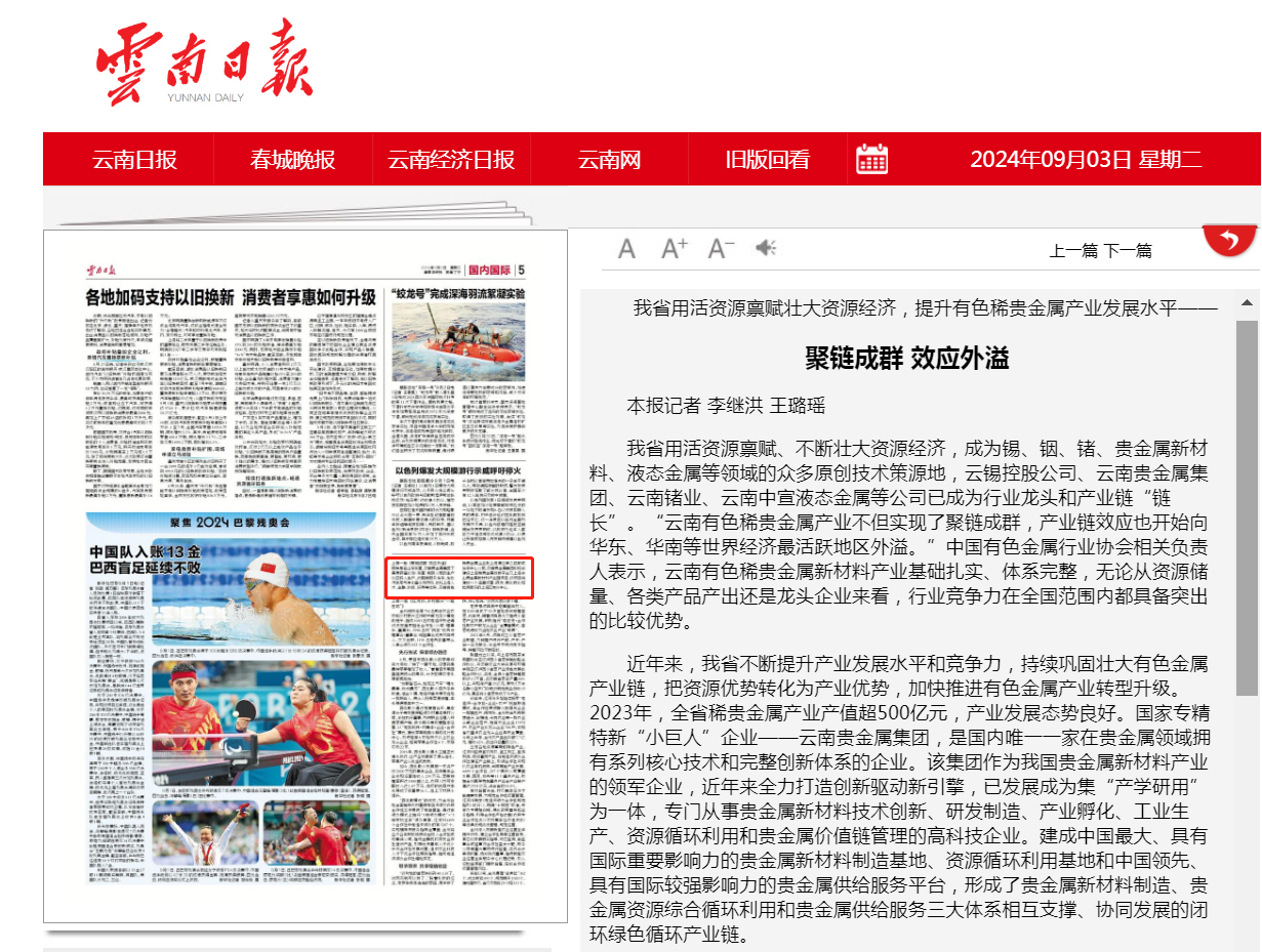 我省用活資源稟賦、不斷壯大資源經(jīng)濟(jì),成為錫、銦、鍺、貴金屬新材料、液態(tài)金屬等領(lǐng)域的眾多原創(chuàng)技術(shù)策源地,云錫控股公司、云南貴金屬集團(tuán)、云南鍺業(yè)、云南中宣液態(tài)金屬等公司已成為行業(yè)龍頭和產(chǎn)業(yè)鏈“鏈長(zhǎng)”。“云南有色稀貴金屬產(chǎn)業(yè)不但實(shí)現(xiàn)了聚鏈成群,產(chǎn)業(yè)鏈效應(yīng)也開始向華東、華南等世界經(jīng)濟(jì)最活躍地區(qū)外溢?!敝袊?guó)有色金屬行業(yè)協(xié)會(huì)相關(guān)負(fù)責(zé)人表示,云南有色稀貴金屬新材料產(chǎn)業(yè)基礎(chǔ)扎實(shí)、體系完整,無論從資源儲(chǔ)量、各類產(chǎn)品產(chǎn)出還是龍頭企業(yè)來看,行業(yè)競(jìng)爭(zhēng)力在全國(guó)范圍內(nèi)都具備突出的比較優(yōu)勢(shì)。