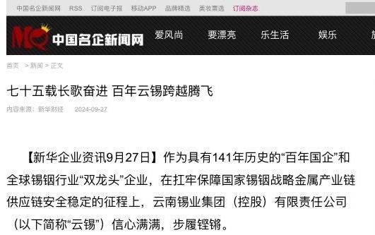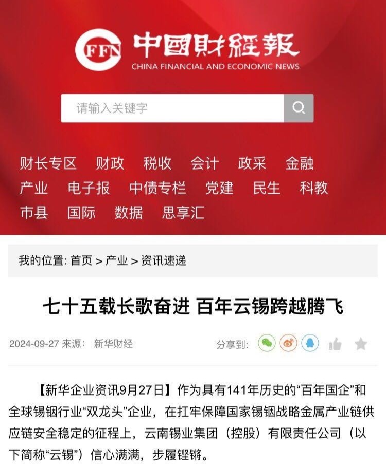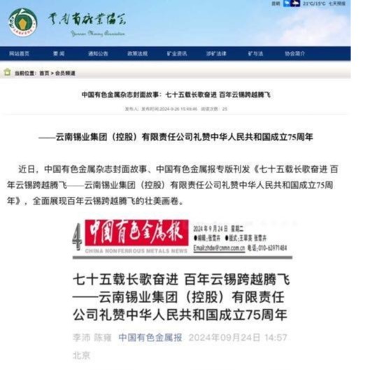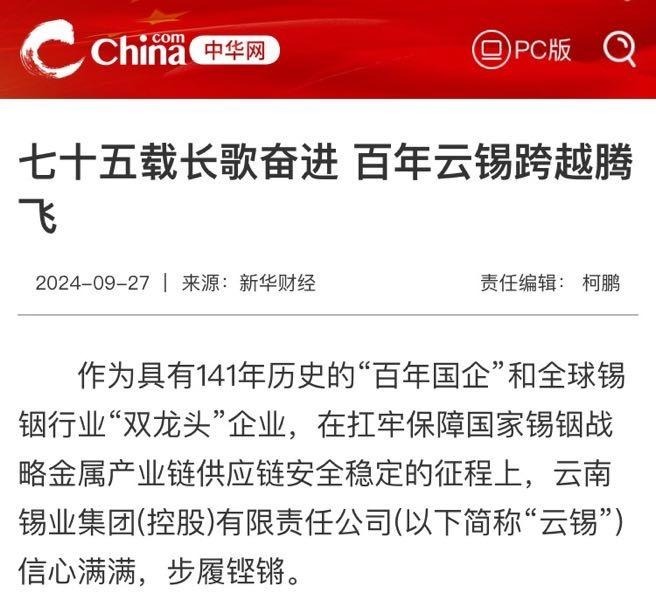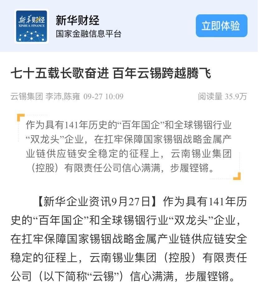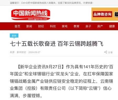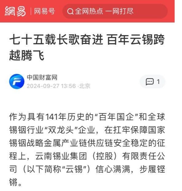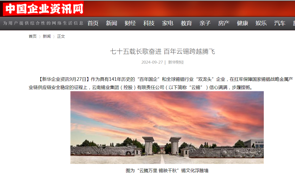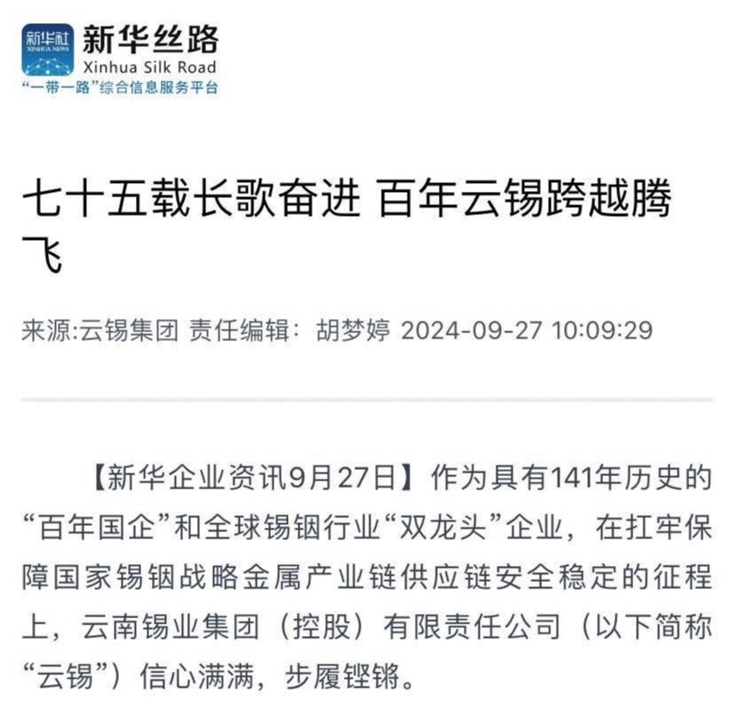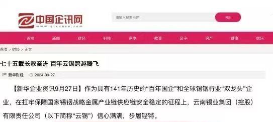 自9月25日中國有色金屬雜志封面故事、中國有色金屬報(bào)專版刊發(fā)《七十五載長歌奮進(jìn) 百年云錫跨越騰飛——云南錫業(yè)集團(tuán)(控股)有限責(zé)任公司禮贊中華人民共和國成立75周年》以來,該文章在新華絲路、新華財(cái)經(jīng)、中國金融信息網(wǎng)、中國財(cái)富網(wǎng)等多個(gè)平臺(tái)發(fā)布,并在第一時(shí)間被主流渠道、門戶網(wǎng)站及重點(diǎn)信息服務(wù)機(jī)構(gòu)廣泛轉(zhuǎn)載落地,總量達(dá)174家次,包括人民日?qǐng)?bào)歐洲版、環(huán)球網(wǎng)、中華網(wǎng)、中國經(jīng)濟(jì)網(wǎng)、中國企業(yè)網(wǎng)、企業(yè)觀察報(bào)、大眾網(wǎng)、慧聰網(wǎng)、今日頭條、新浪網(wǎng)、搜狐網(wǎng)、網(wǎng)易新聞、騰訊網(wǎng)等參與轉(zhuǎn)載。