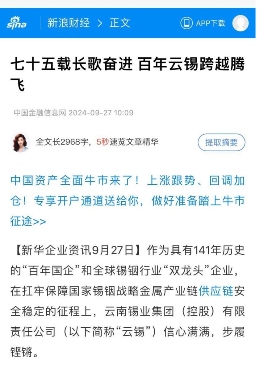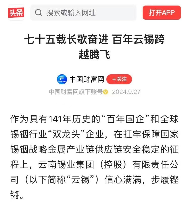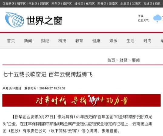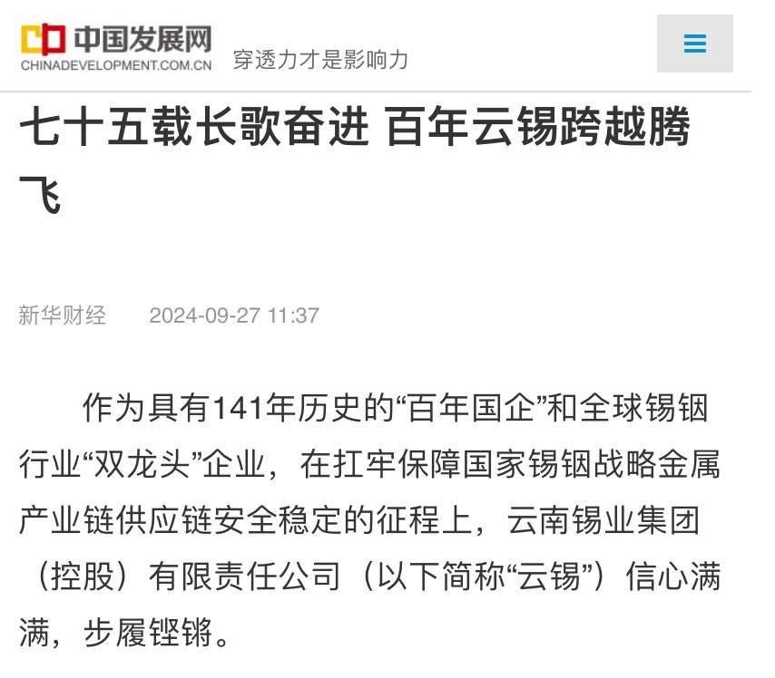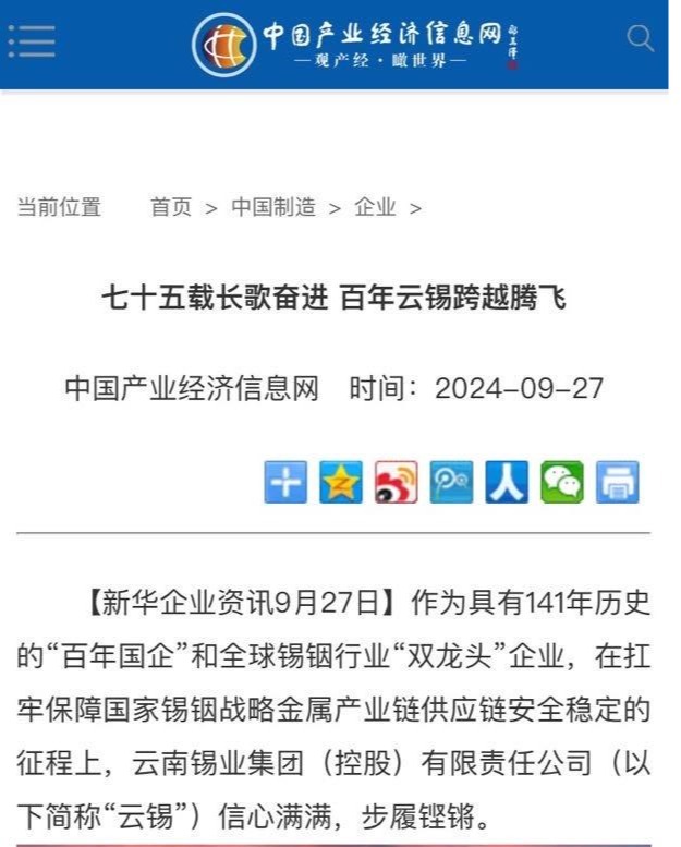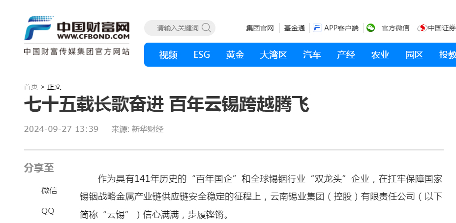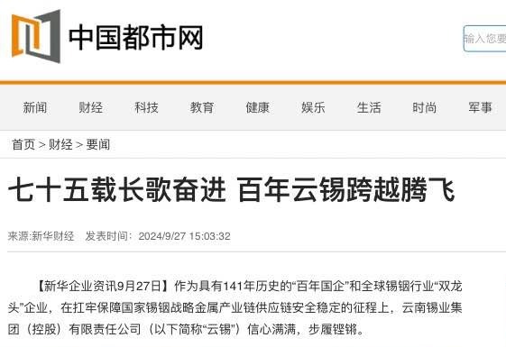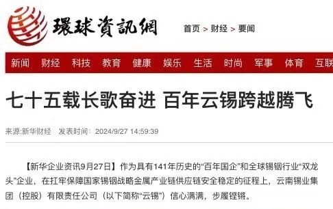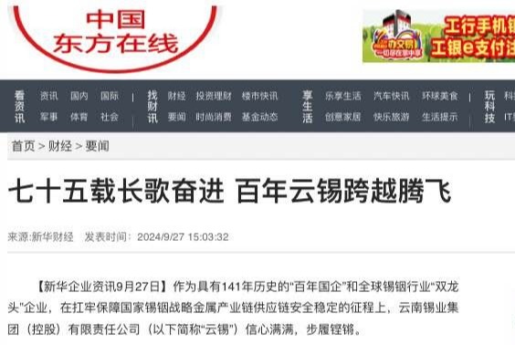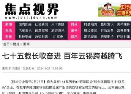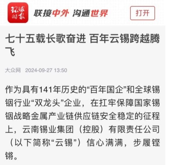 自9月25日中國有色金屬雜志封面故事、中國有色金屬報(bào)專版刊發(fā)《七十五載長歌奮進(jìn) 百年云錫跨越騰飛——云南錫業(yè)集團(tuán)(控股)有限責(zé)任公司禮贊中華人民共和國成立75周年》以來,該文章在新華絲路、新華財(cái)經(jīng)、中國金融信息網(wǎng)、中國財(cái)富網(wǎng)等多個(gè)平臺(tái)發(fā)布,并在第一時(shí)間被主流渠道、門戶網(wǎng)站及重點(diǎn)信息服務(wù)機(jī)構(gòu)廣泛轉(zhuǎn)載落地,總量達(dá)174家次,包括人民日?qǐng)?bào)歐洲版、環(huán)球網(wǎng)、中華網(wǎng)、中國經(jīng)濟(jì)網(wǎng)、中國企業(yè)網(wǎng)、企業(yè)觀察報(bào)、大眾網(wǎng)、慧聰網(wǎng)、今日頭條、新浪網(wǎng)、搜狐網(wǎng)、網(wǎng)易新聞、騰訊網(wǎng)等參與轉(zhuǎn)載。