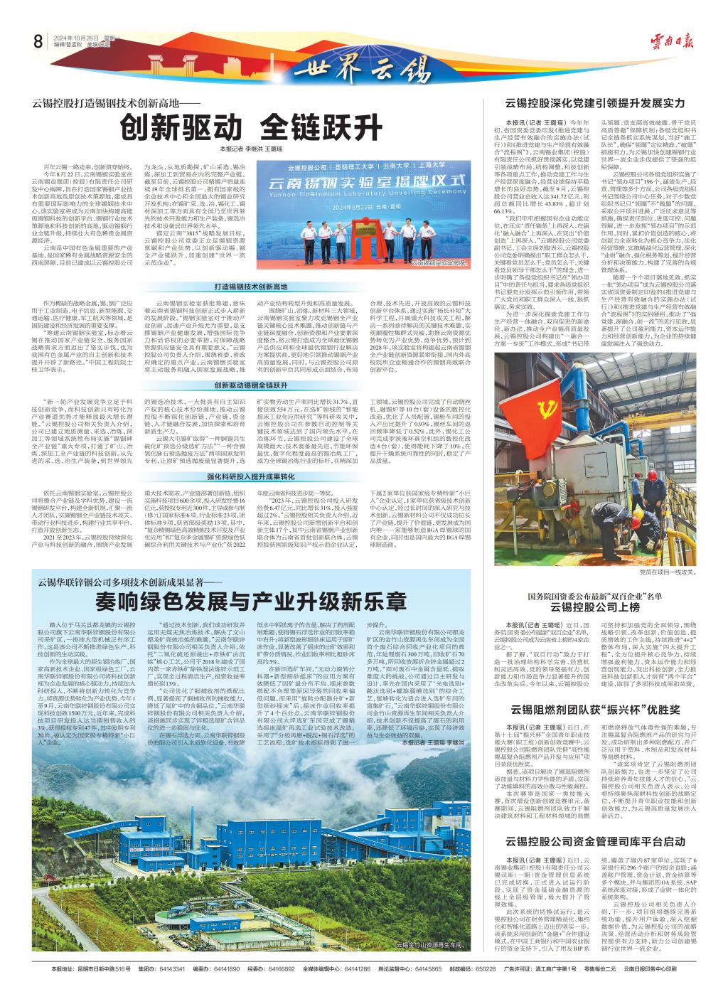 錨定云南“3815”戰(zhàn)略發(fā)展目標,云錫控股公司黨委正立足錫銦資源稟賦和產(chǎn)業(yè)優(yōu)勢,以創(chuàng)新驅動錫、銦全產(chǎn)業(yè)鏈躍升,加速創(chuàng)建“世界一流企業(yè)”。